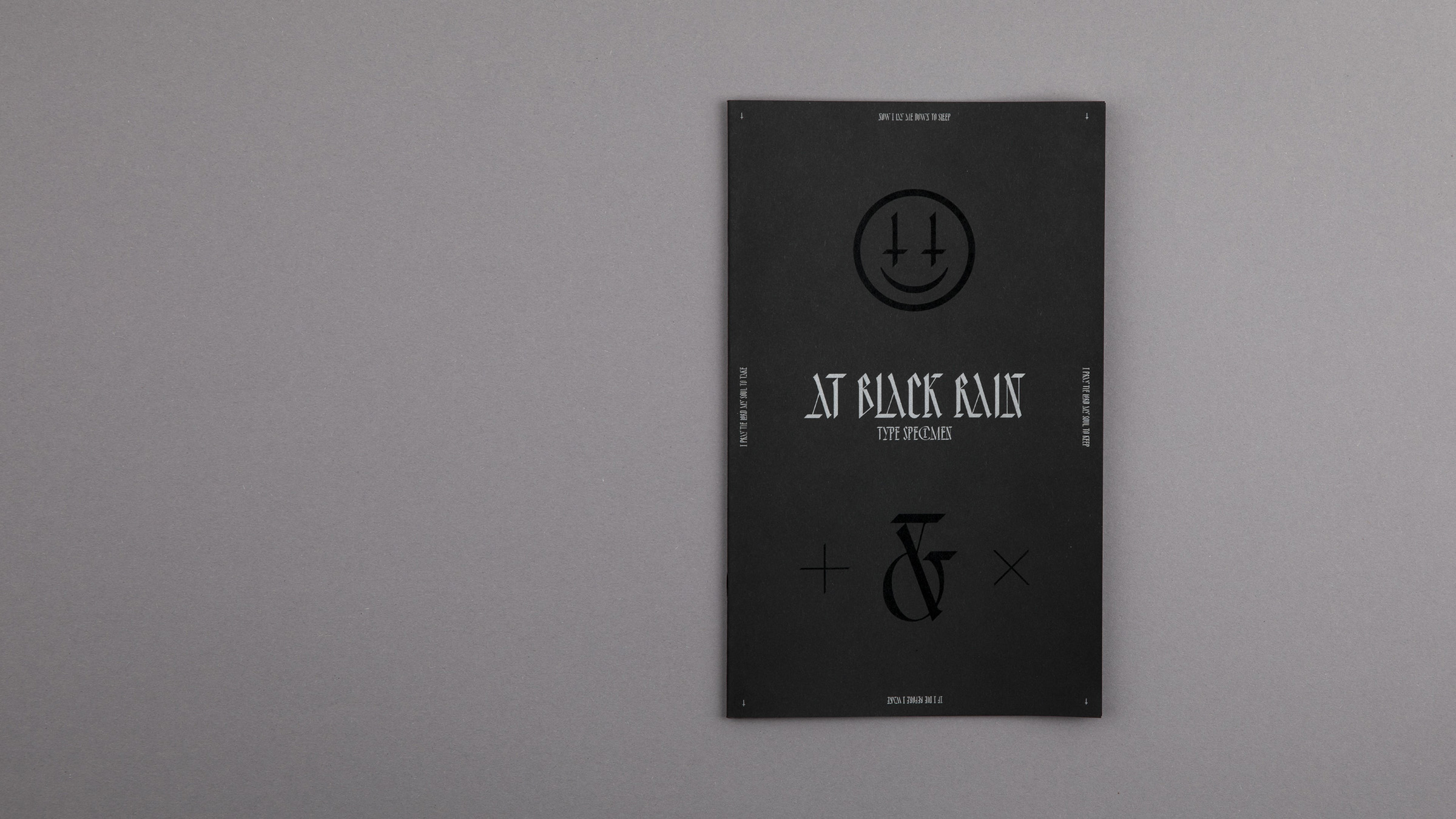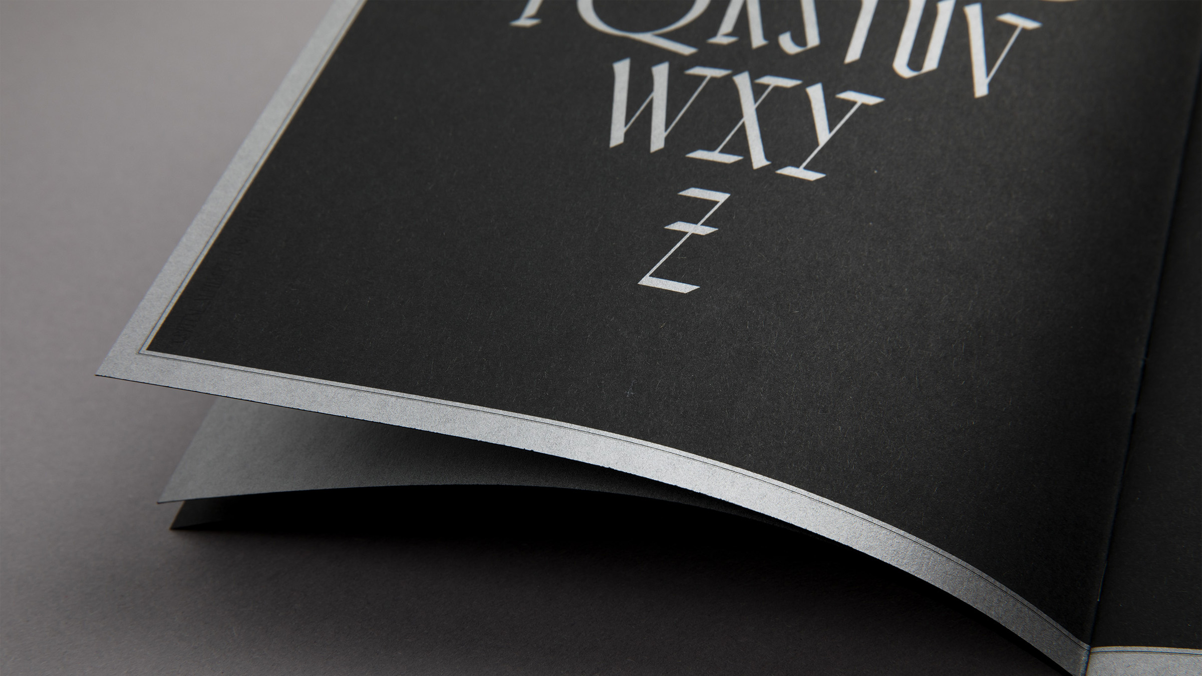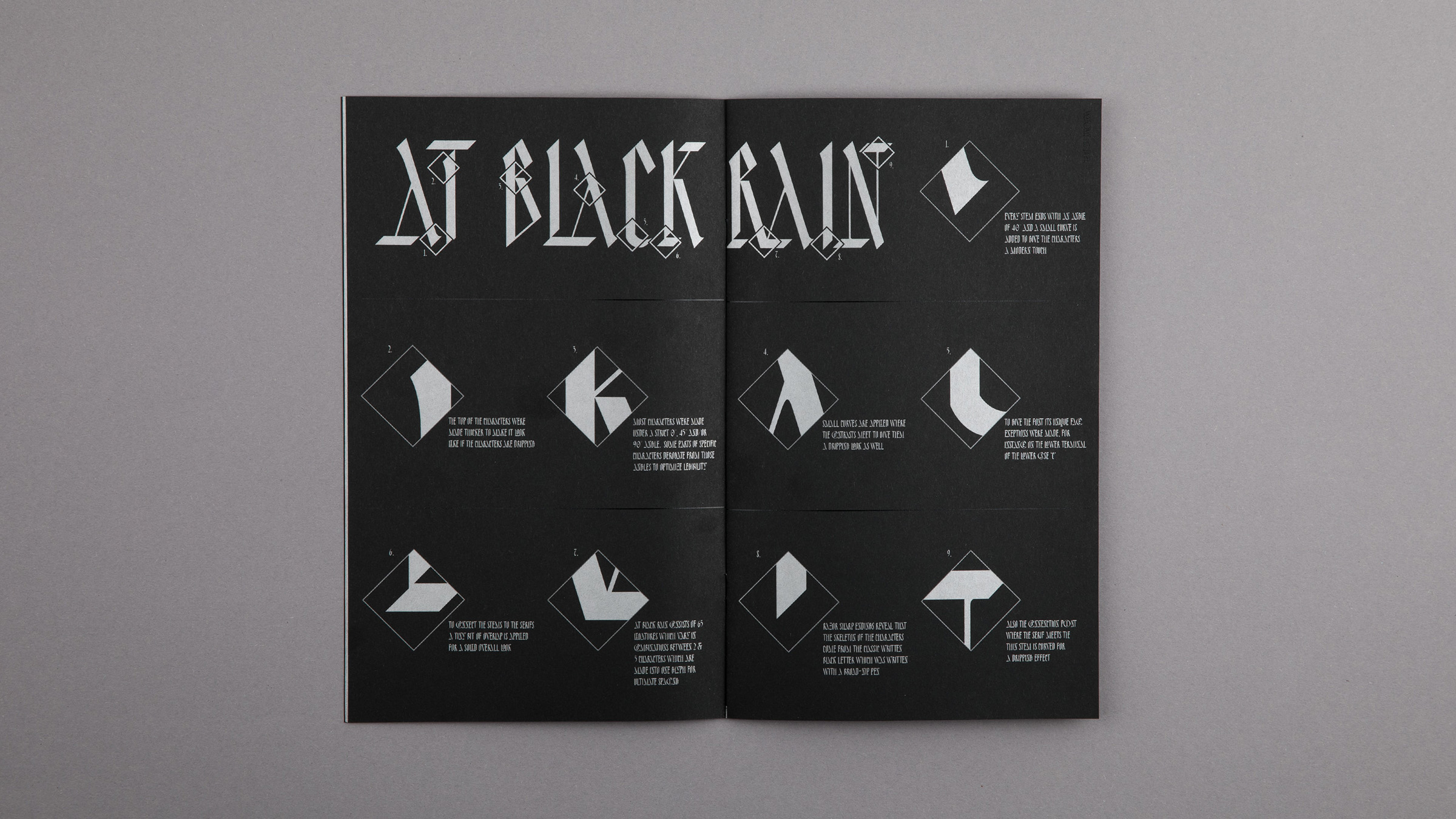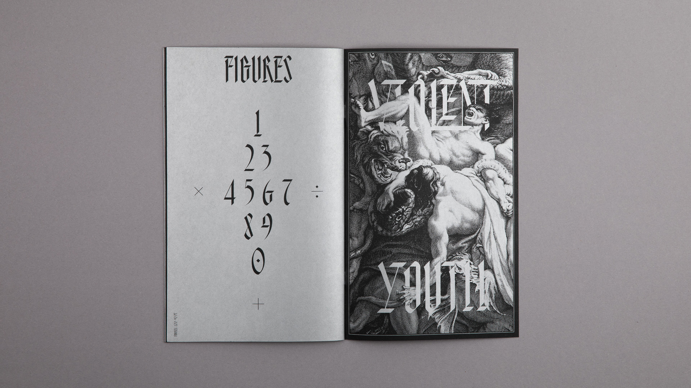 The font AT Violent Youth (previously known as AT Black Rain) was designed over the course of 6 months during my internship at ATTAK. Its distinctive glyphs are designed with the most suitable curves and shapes. To extend display qualities the AT Black Rain features 65 ligatures. The remarkable shapes result in a razor sharp typographic palette combining the dark ages with brighter modern times. Printed with black and silver ink on black paper.