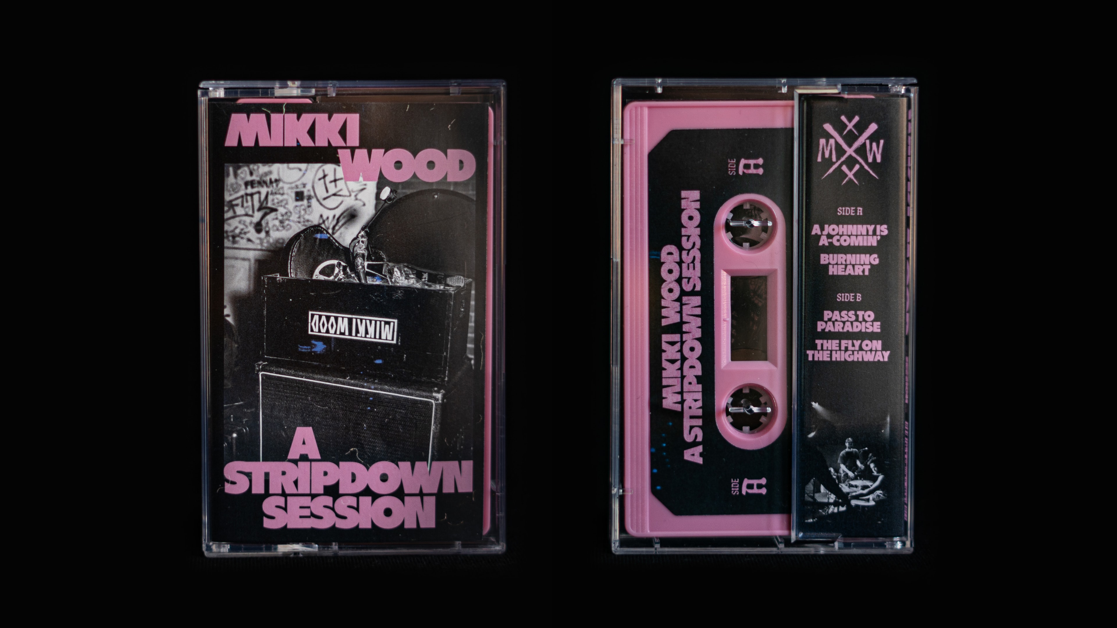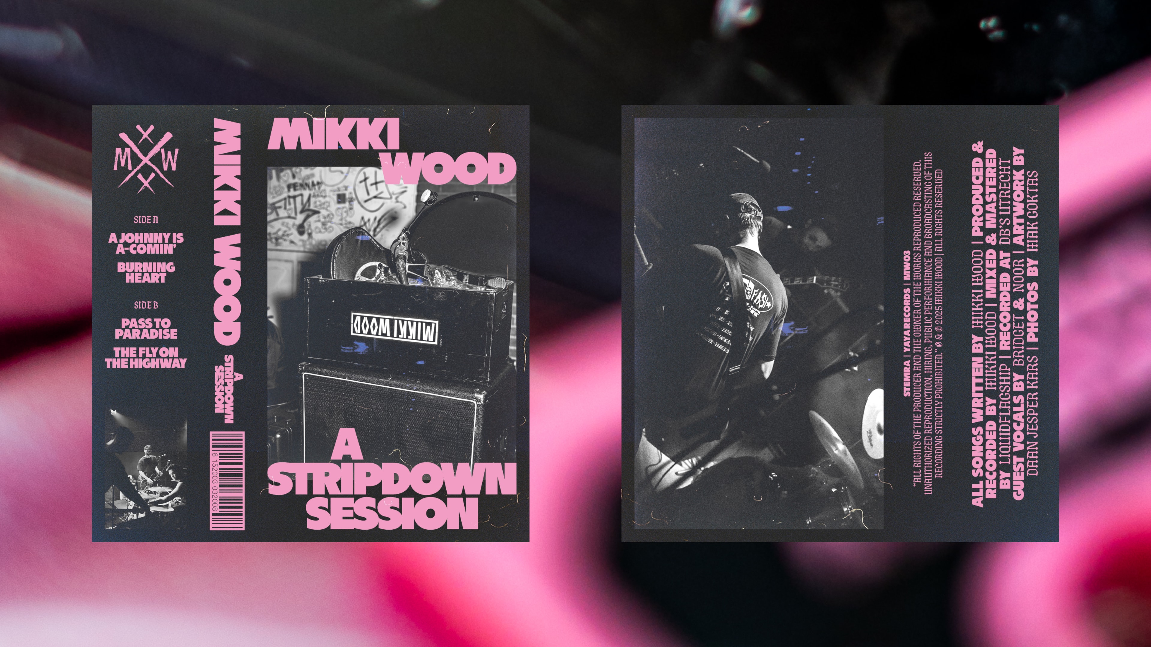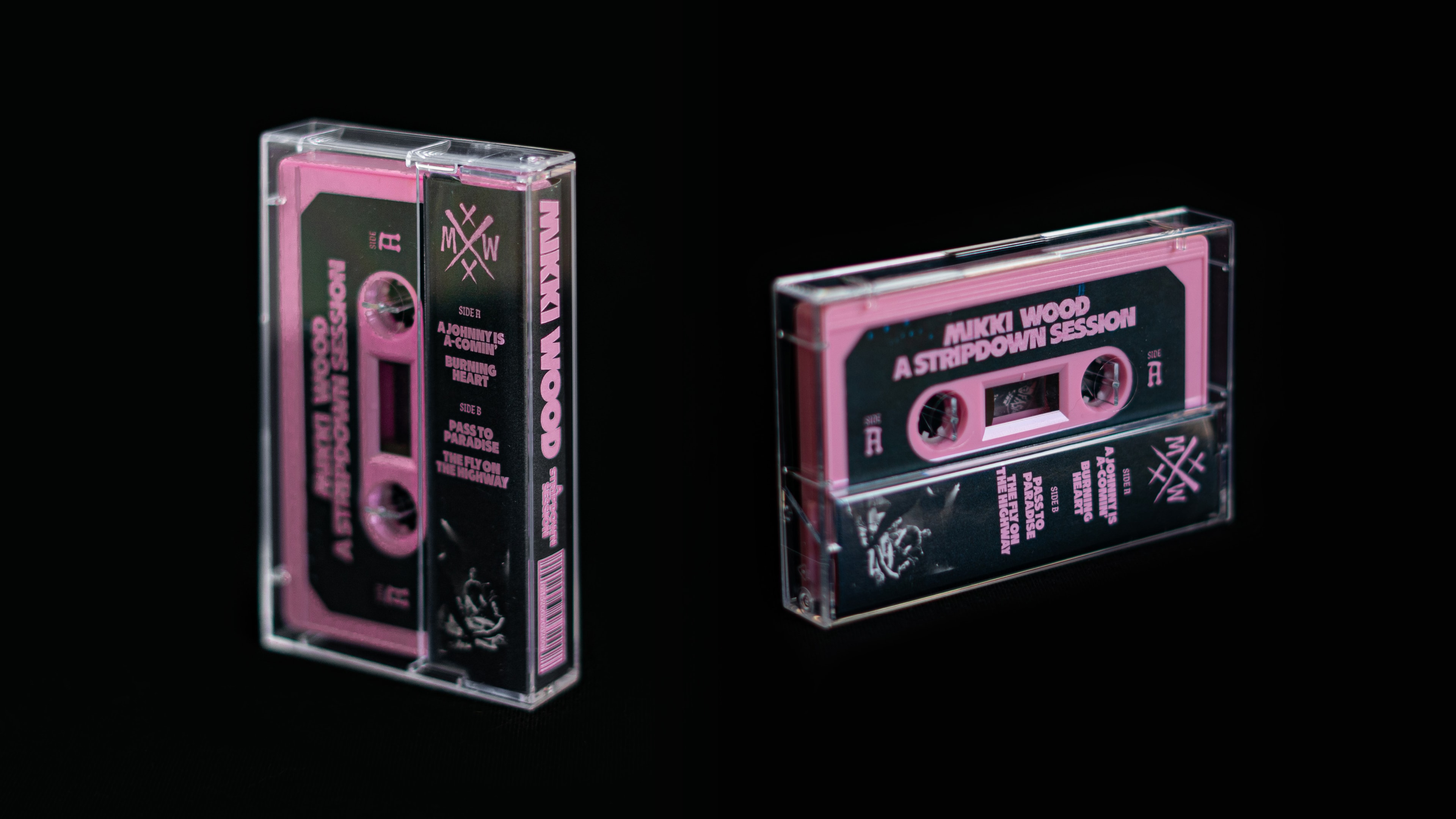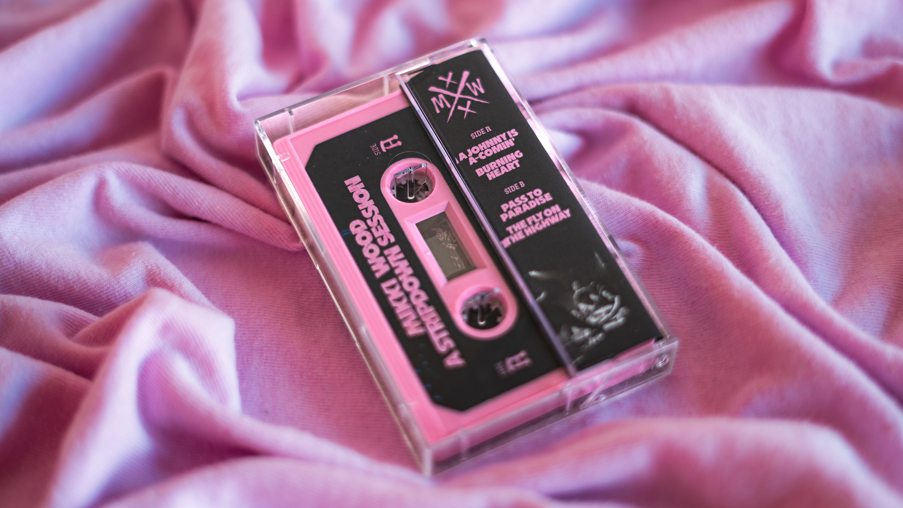 Artwork for Mikki Wood's acoustic EP on cassette. The EP features 4 stripped-down versions of songs from their first single “Mikki Wood” and their debut album “High on the Moon”. During their one-day-tour through the Netherlands, a limited amount of cassettes have been produced and sold during the Record Store Day on the 12th of April.