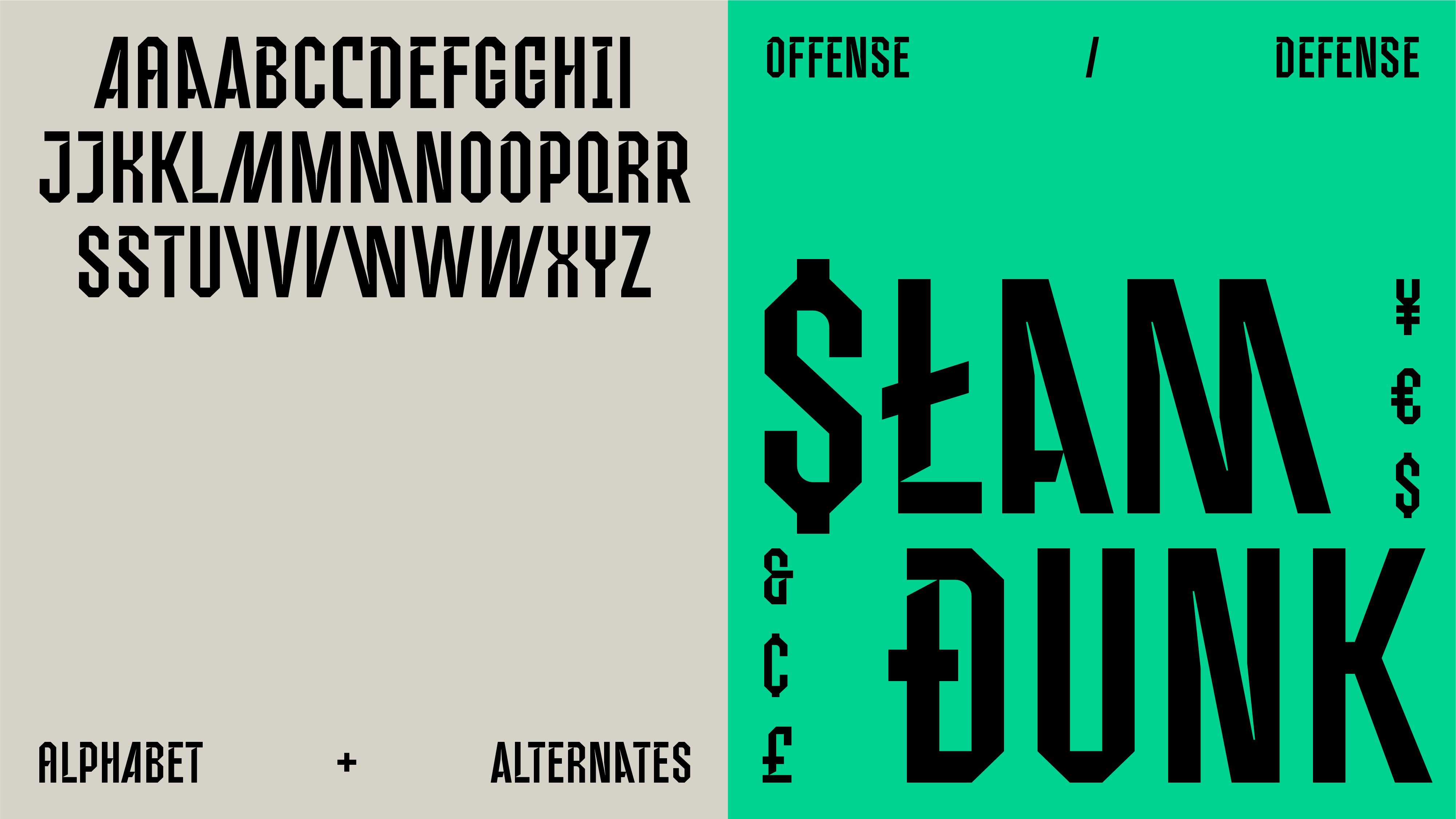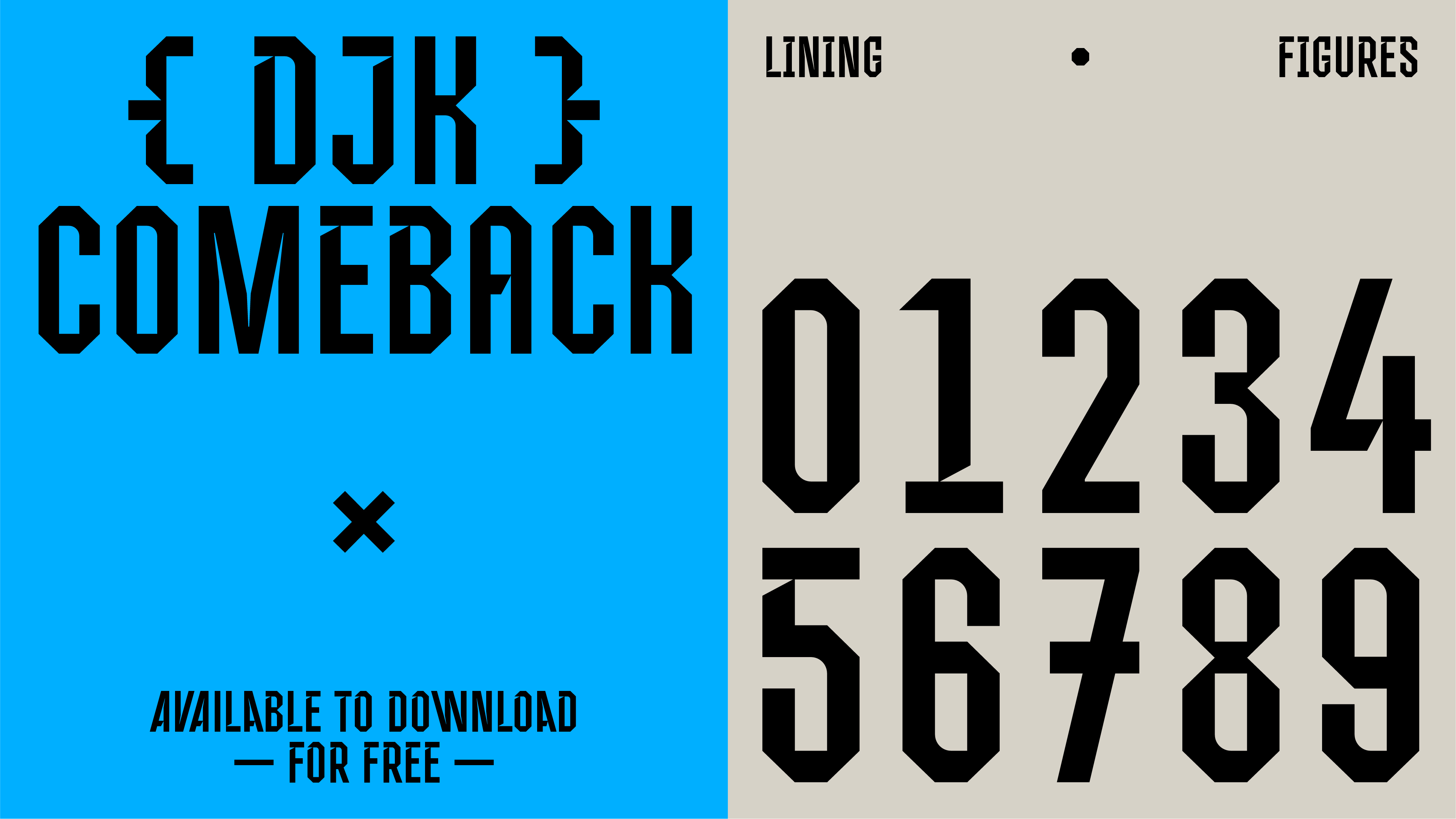Inspired by American football and college sports typography, DJK Comeback visually represents an energetic and bold attitude. It includes a few opentype features to play around with while typesetting. The font is licensed under the SIL Open Font License, Version 1.1.