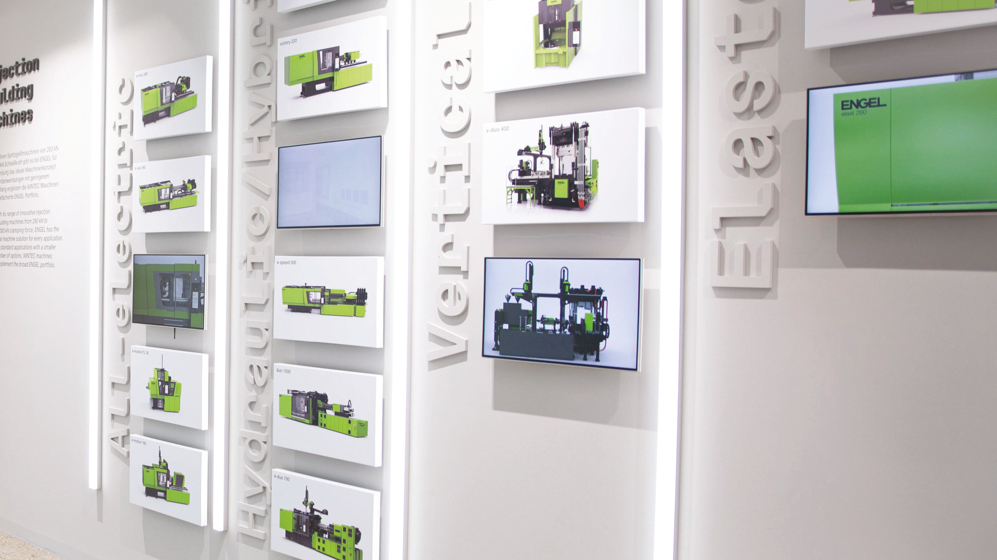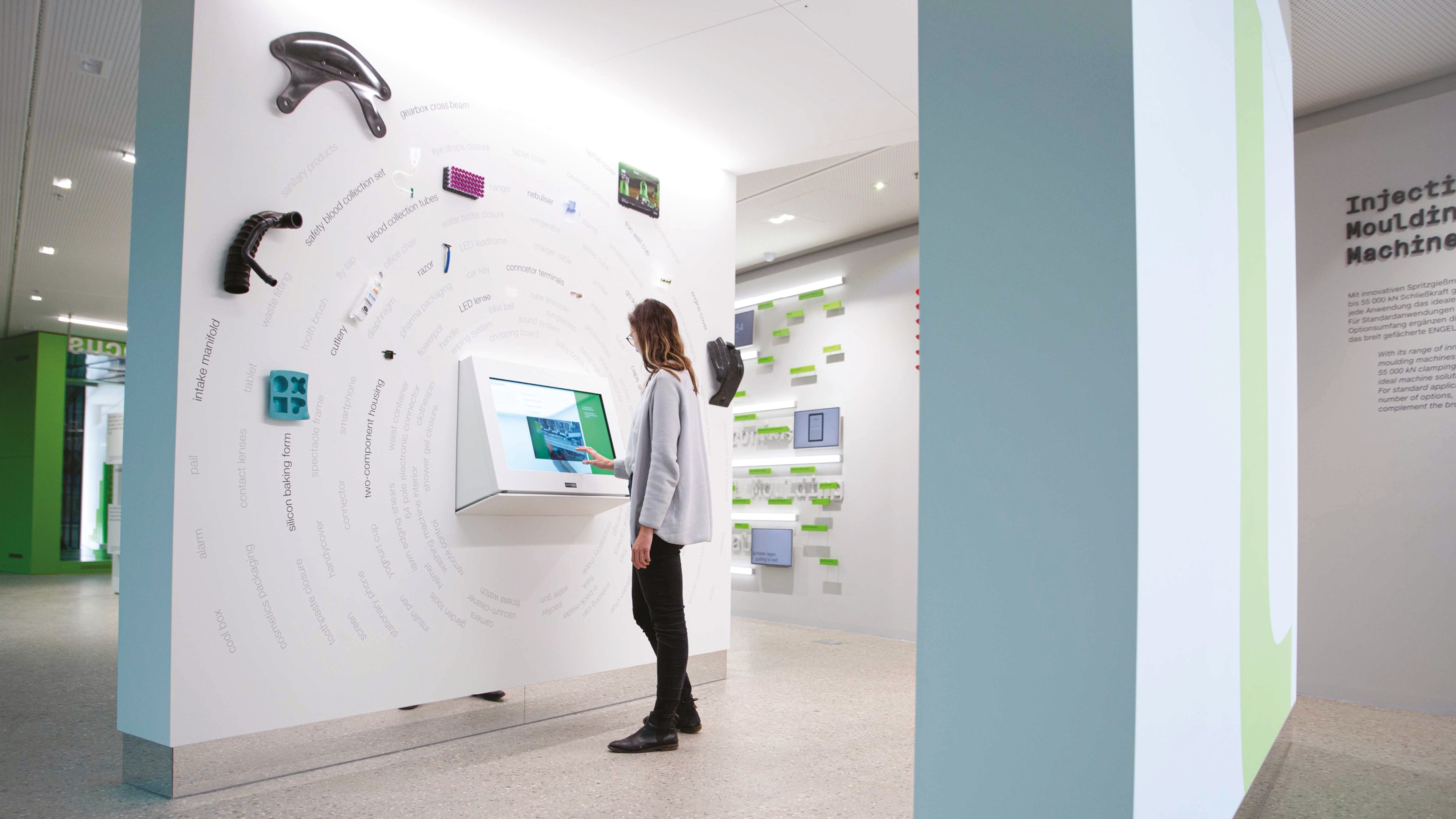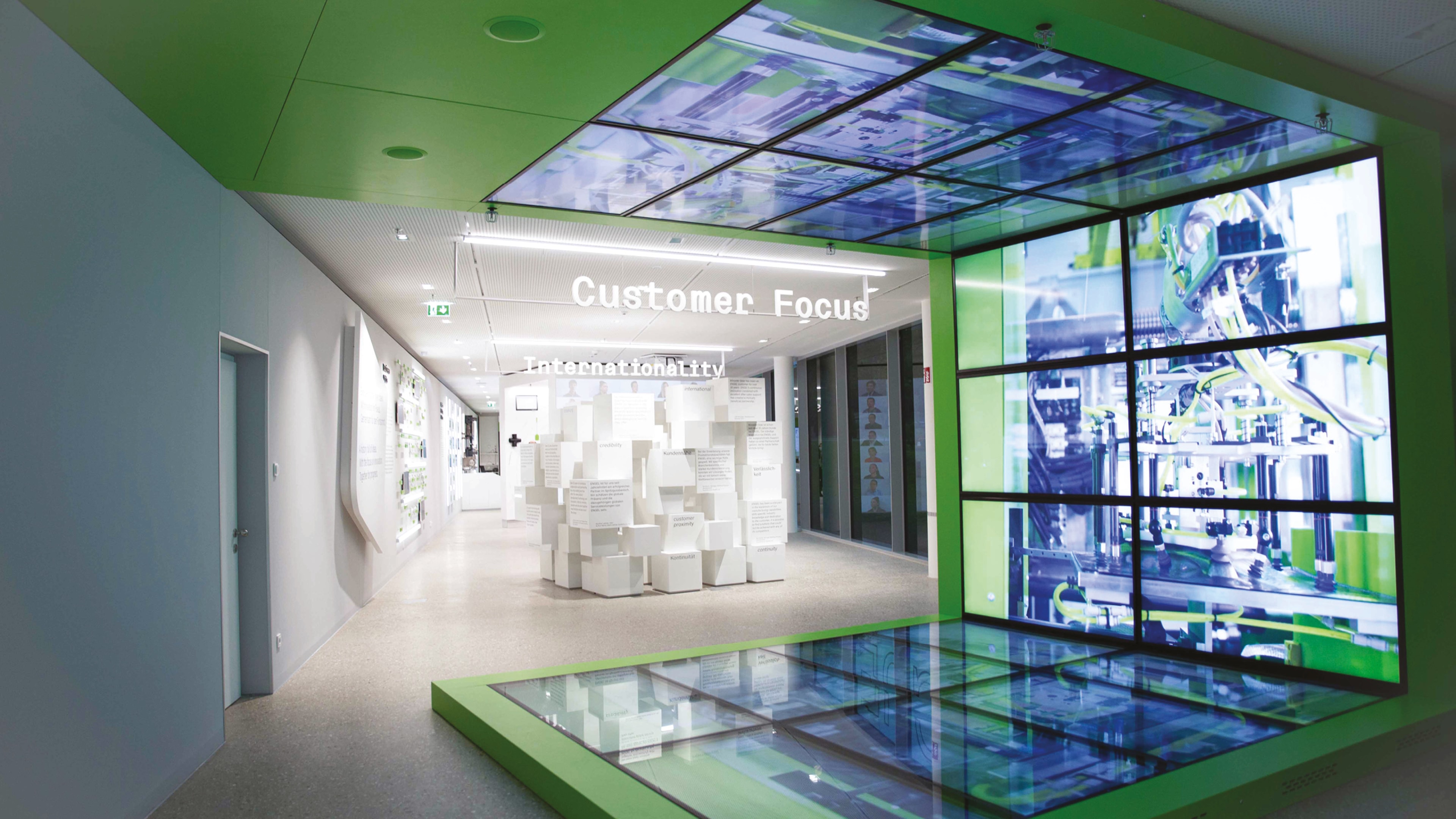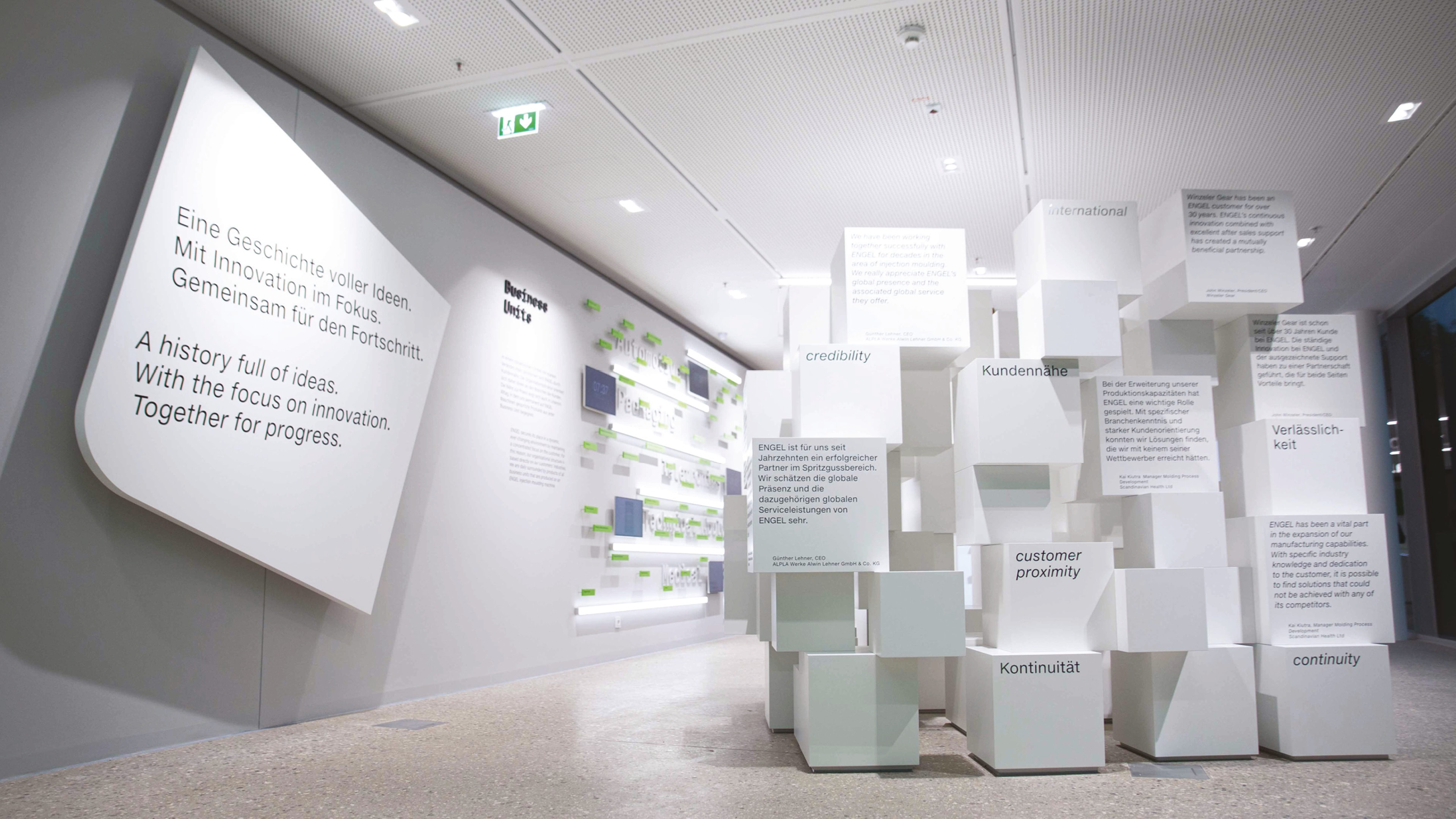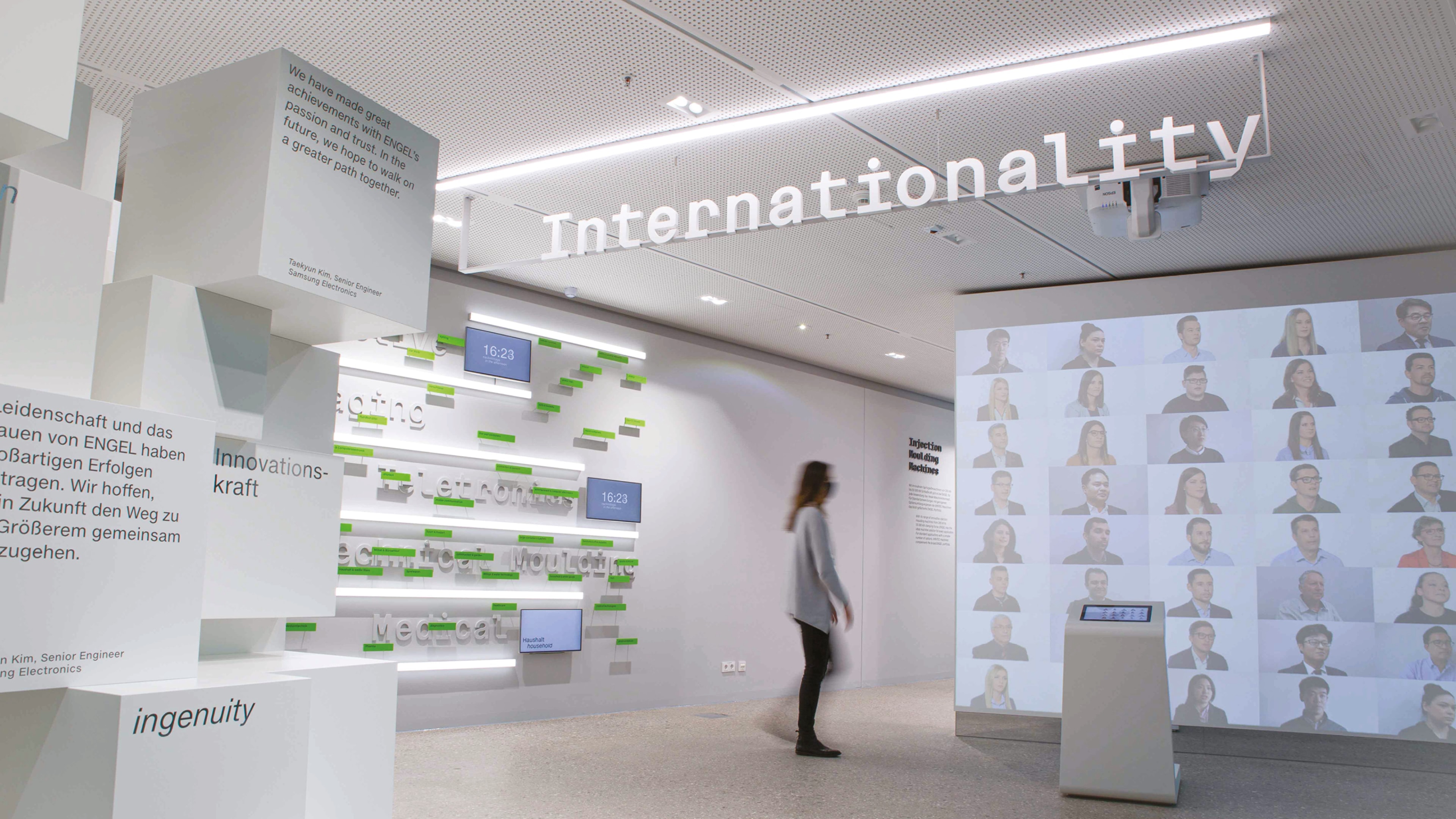 The exhibition ENGEL Dialogue (at the ENGEL Headquarters in Schwertberg, Austria) was architecturally designed as an open and transparent machine unit with an exciting sequence of different thematic islands explaining the companies philosophy and achievements. The company Responsive Spaces accompanied the realisation of all multimedia exhibits whose technological spectrum ranges from transparent and movable displays to head-mounted augmented reality.