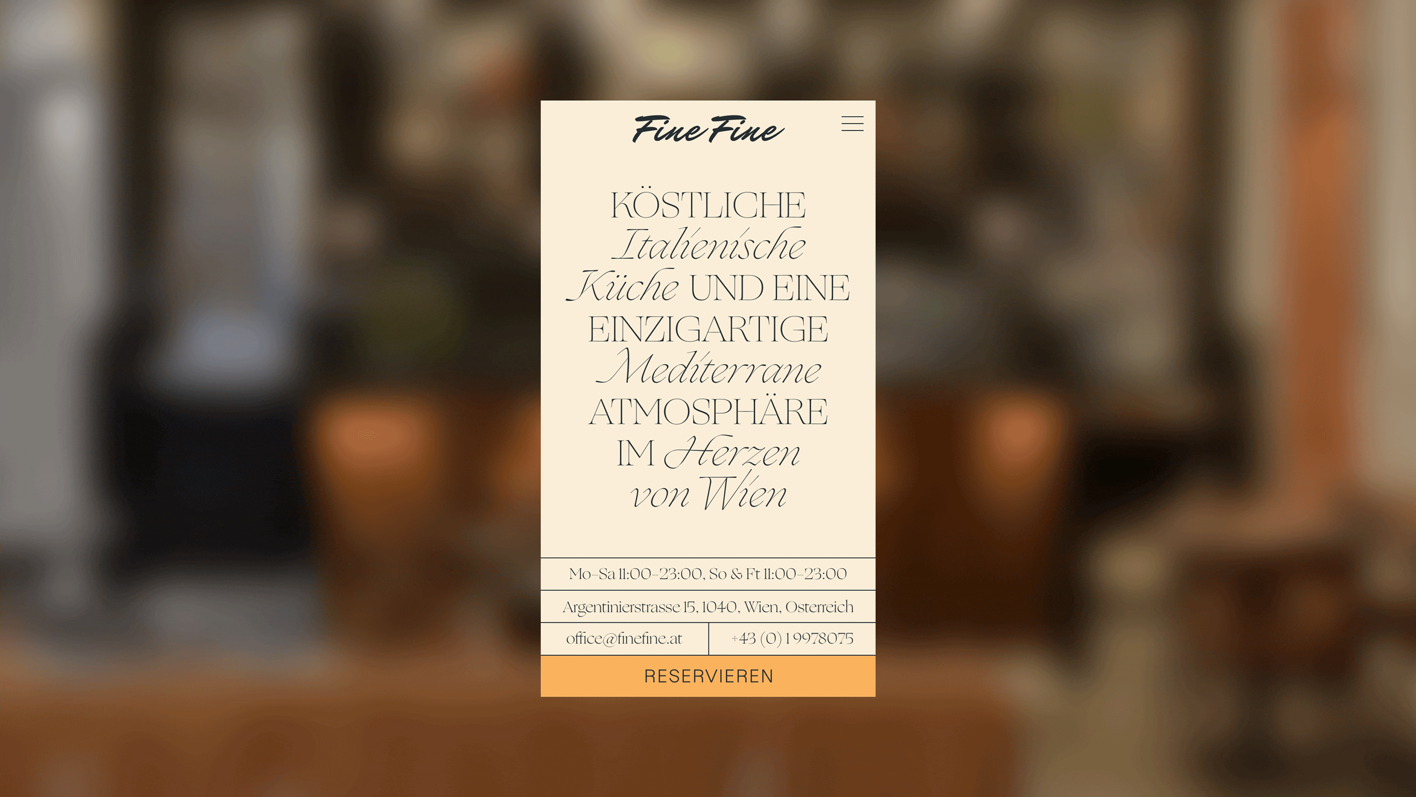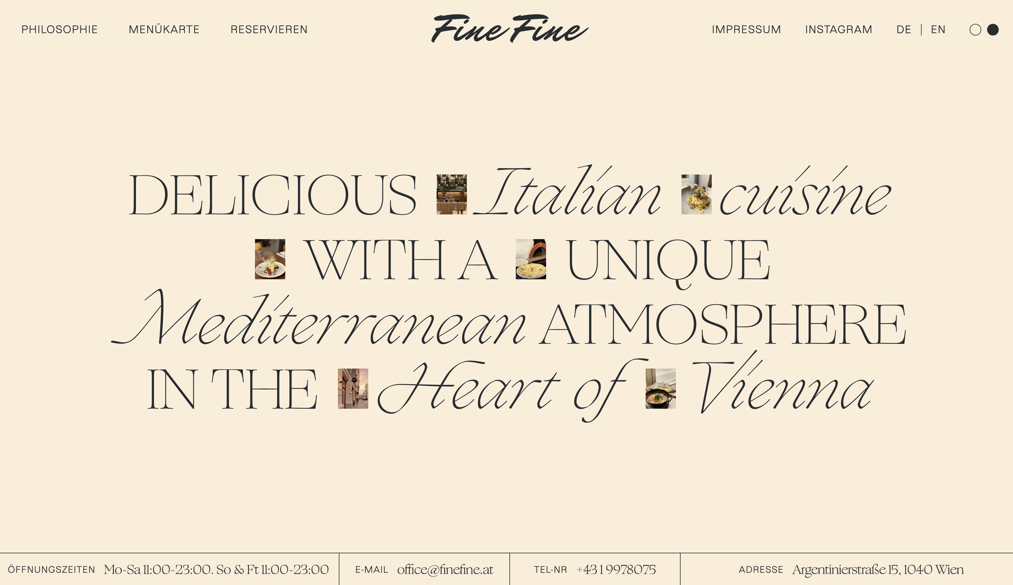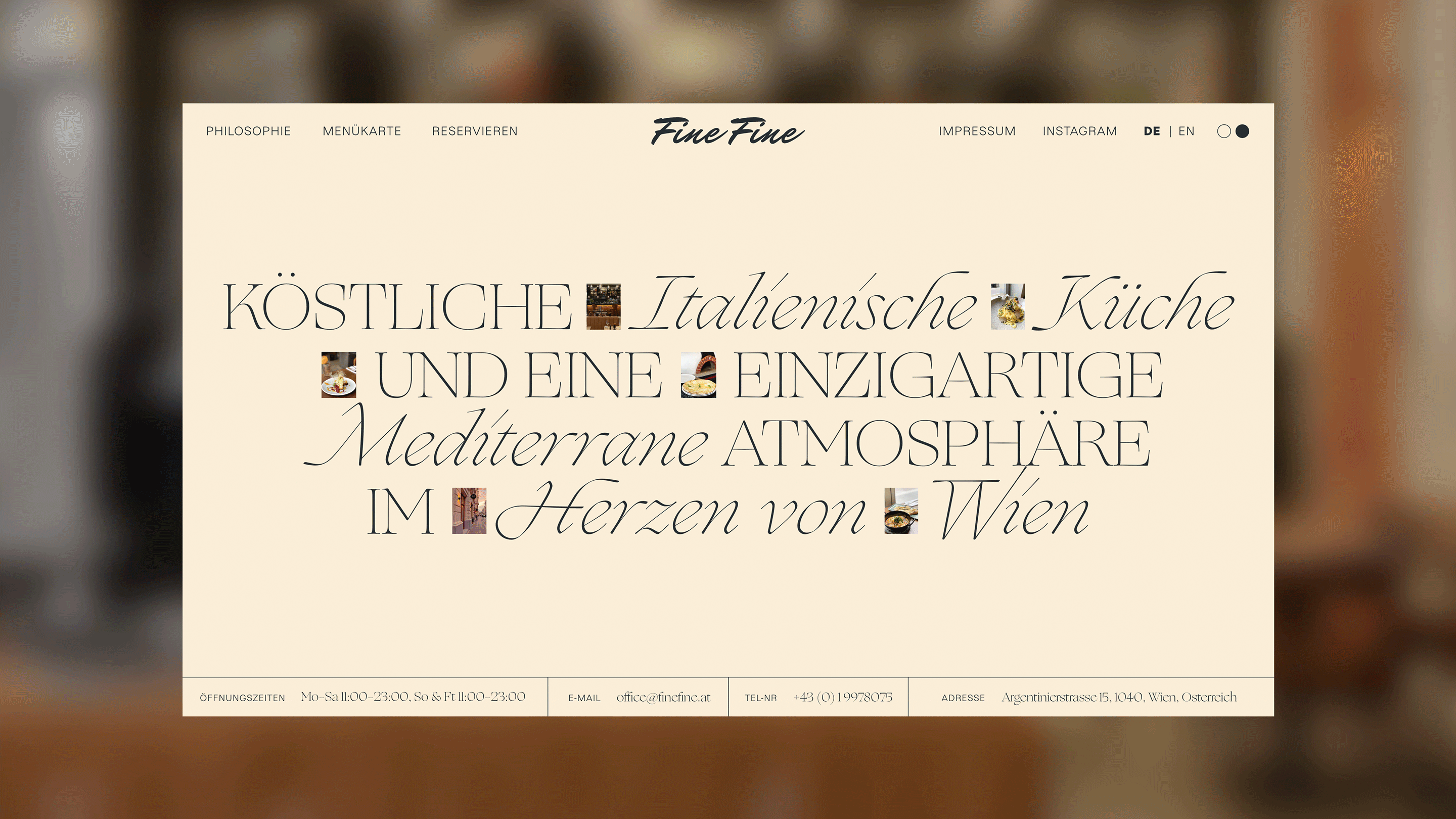 Web design for the Vienna based Italian restaurant and pizzeria Fine Fine. In a very short time, Fine Fine all' Italiana, which offers delicious dishes every day and conveys a distinctive Mediterranean atmosphere, has established itself as a well-attended restaurant and a fixture of Italian cuisine in Vienna. A suiting website which represents the restaurant's quality food and stylish interior was requested and delivered.