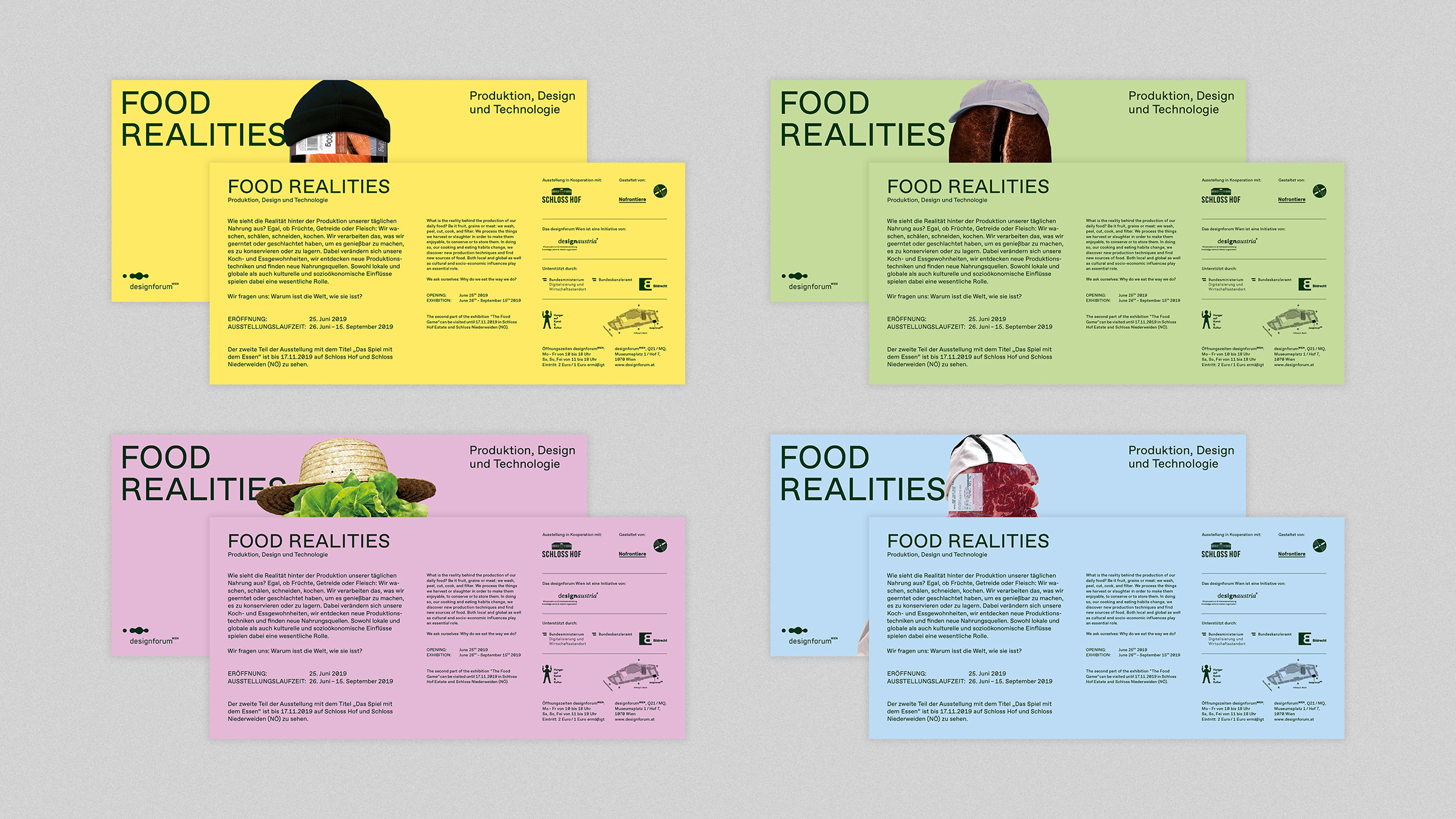 A visual identity for the exhibition about food and supermarket products at DesignForum Wien. An image series based on the road from the origin of a product to the market & beyond was created for the identity. The series portrait the people who ‘work behind the scenes’ as workers/producers of the food and products which we come across daily.