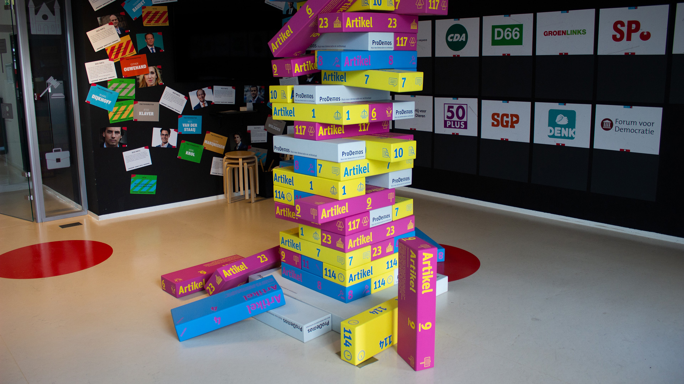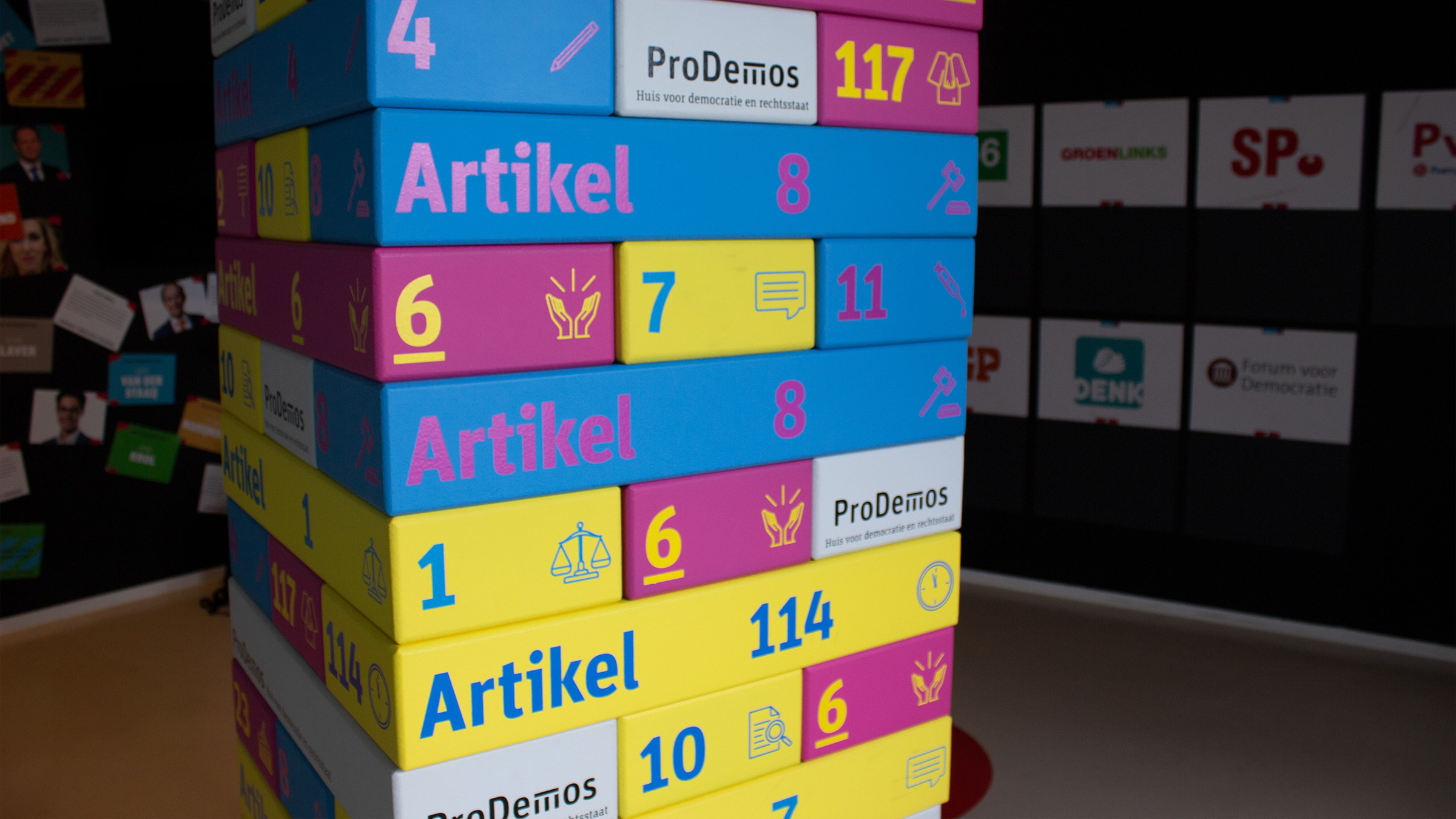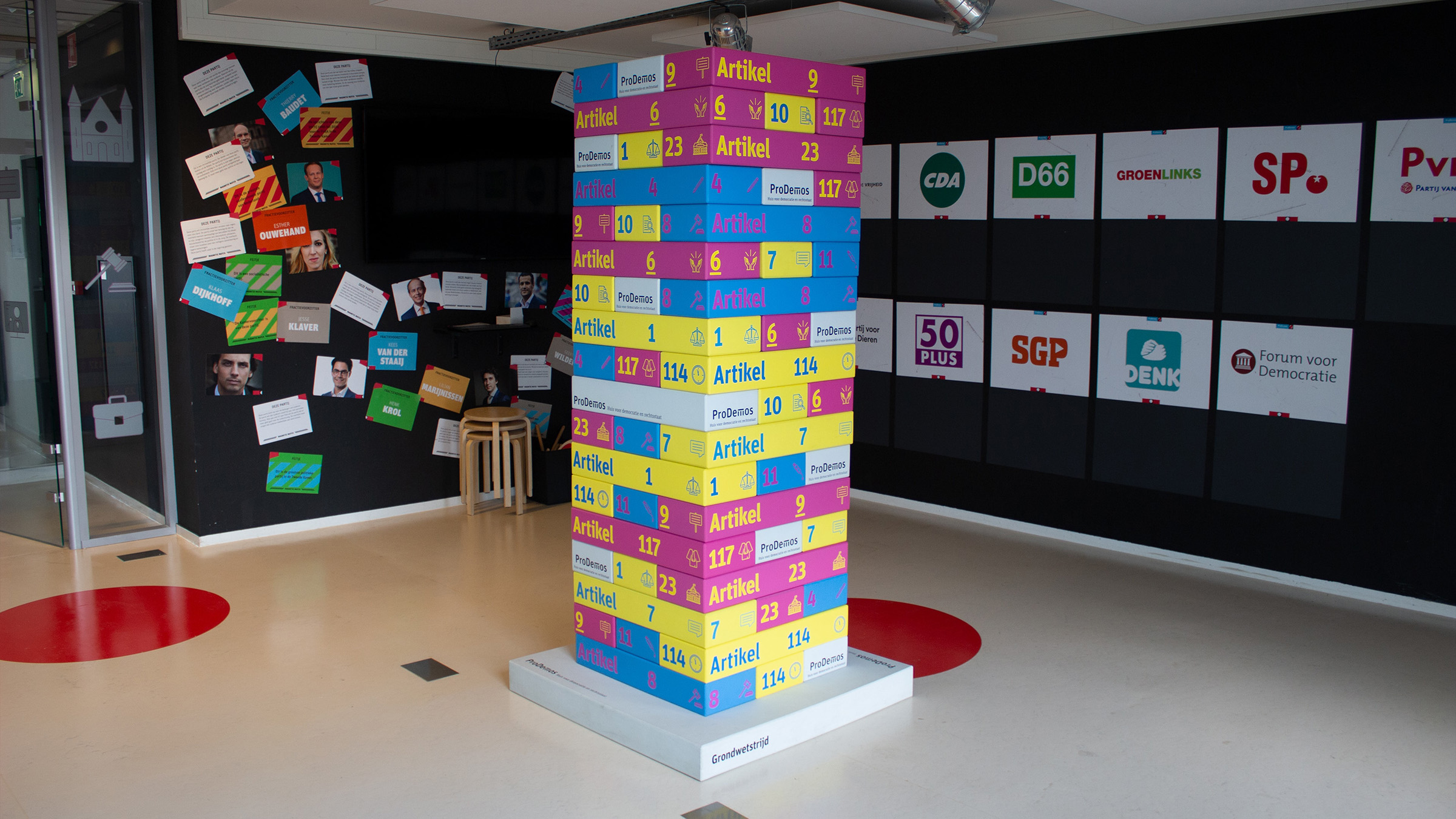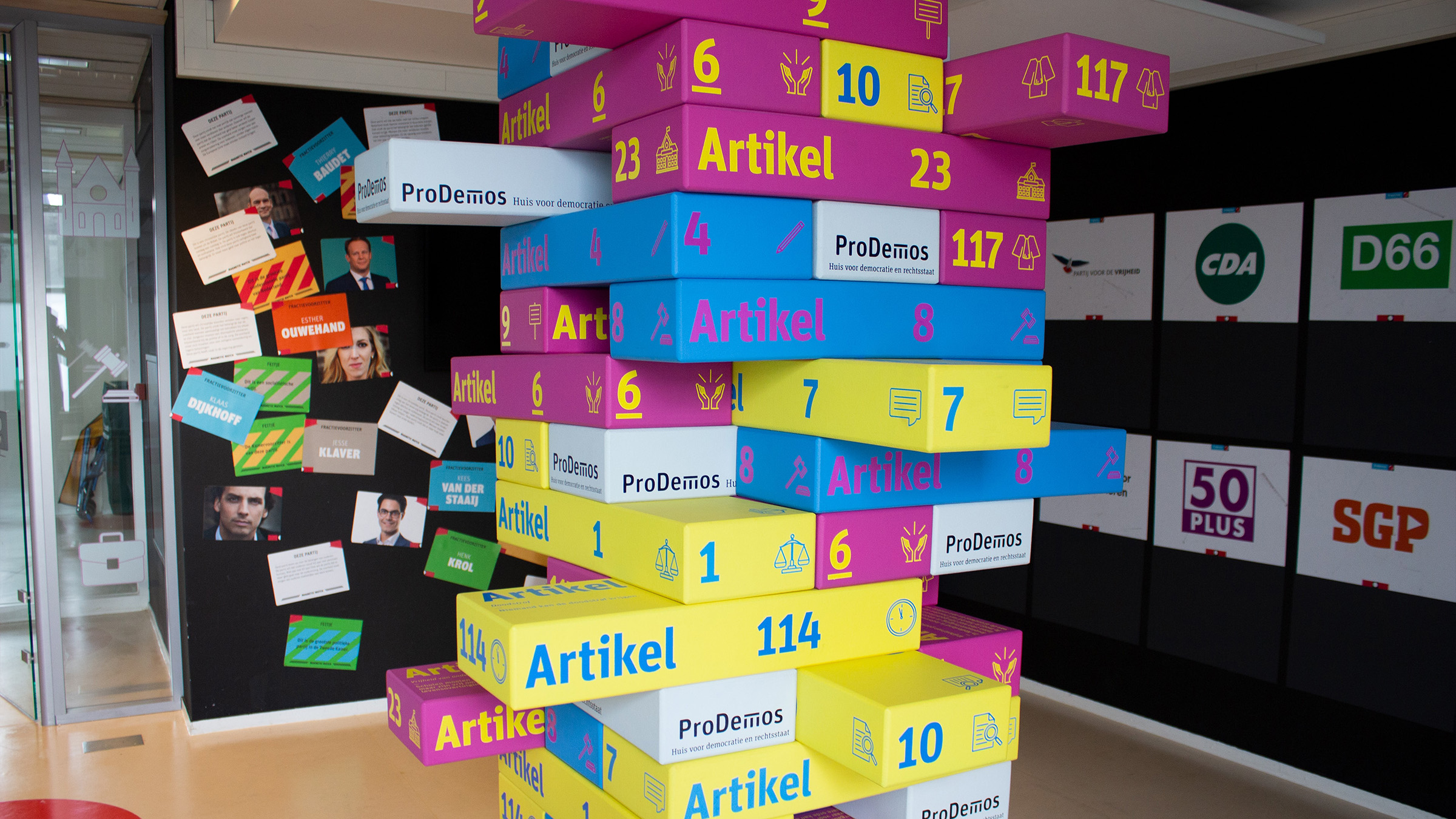 The constitutional articles together form the pilar of democracy. For every article, a statement was written to which students agree or disagree. Based on their opinion they have to take or remove a block from the pilar. By playing, the students learn about the importance of the Dutch contitution. When you ignore/remove too many articles, the pilar will be damaged or even fall. This doesn't mean however, that the constition is unchangeable.