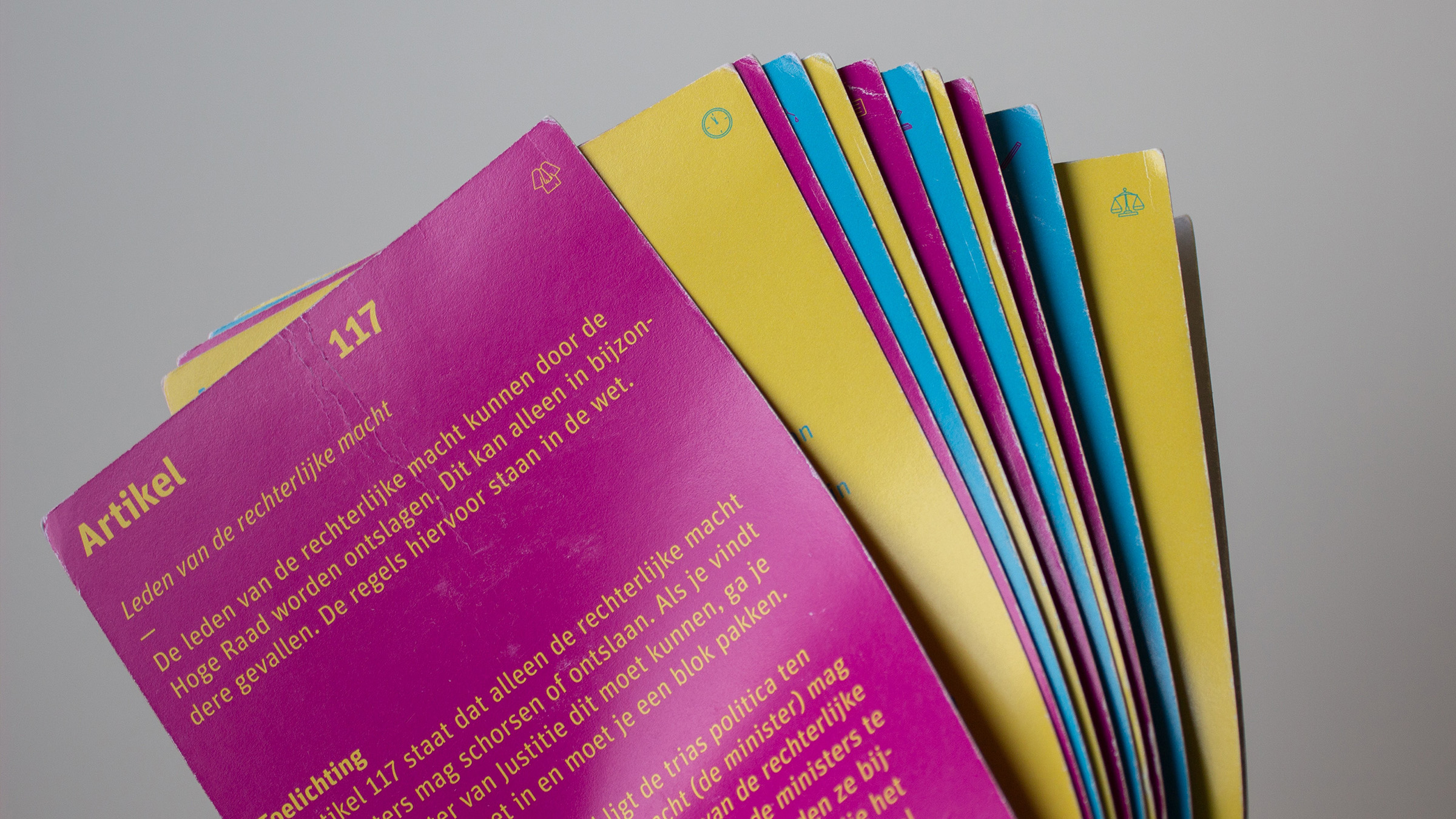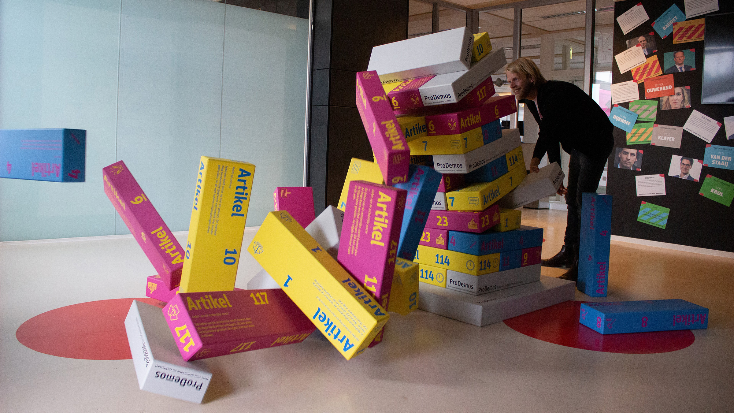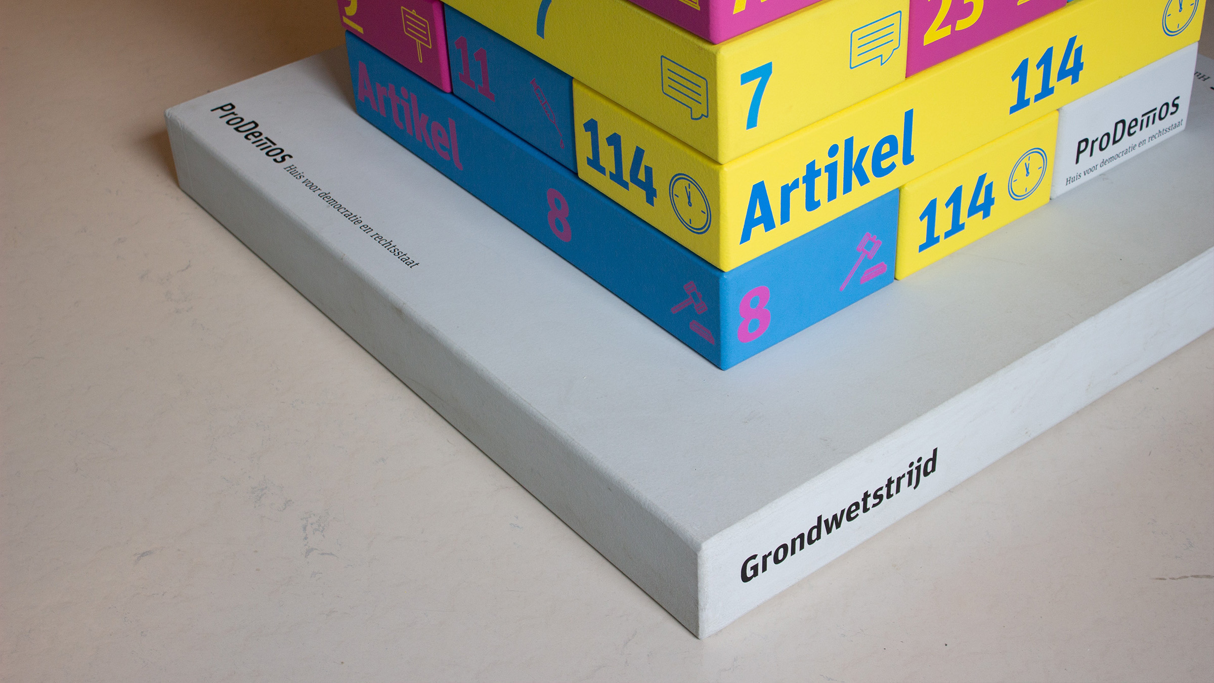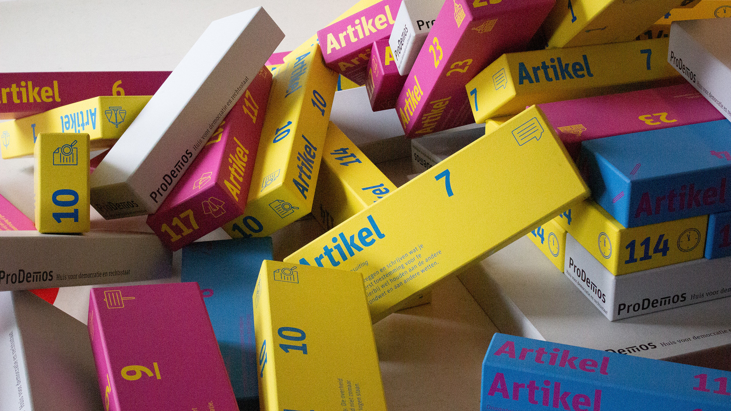 The constitutional articles together form the pilar of democracy. For every article, a statement was written to which students agree or disagree. Based on their opinion they have to take or remove a block from the pilar. By playing, the students learn about the importance of the Dutch contitution. When you ignore/remove too many articles, the pilar will be damaged or even fall. This doesn't mean however, that the constition is unchangeable.