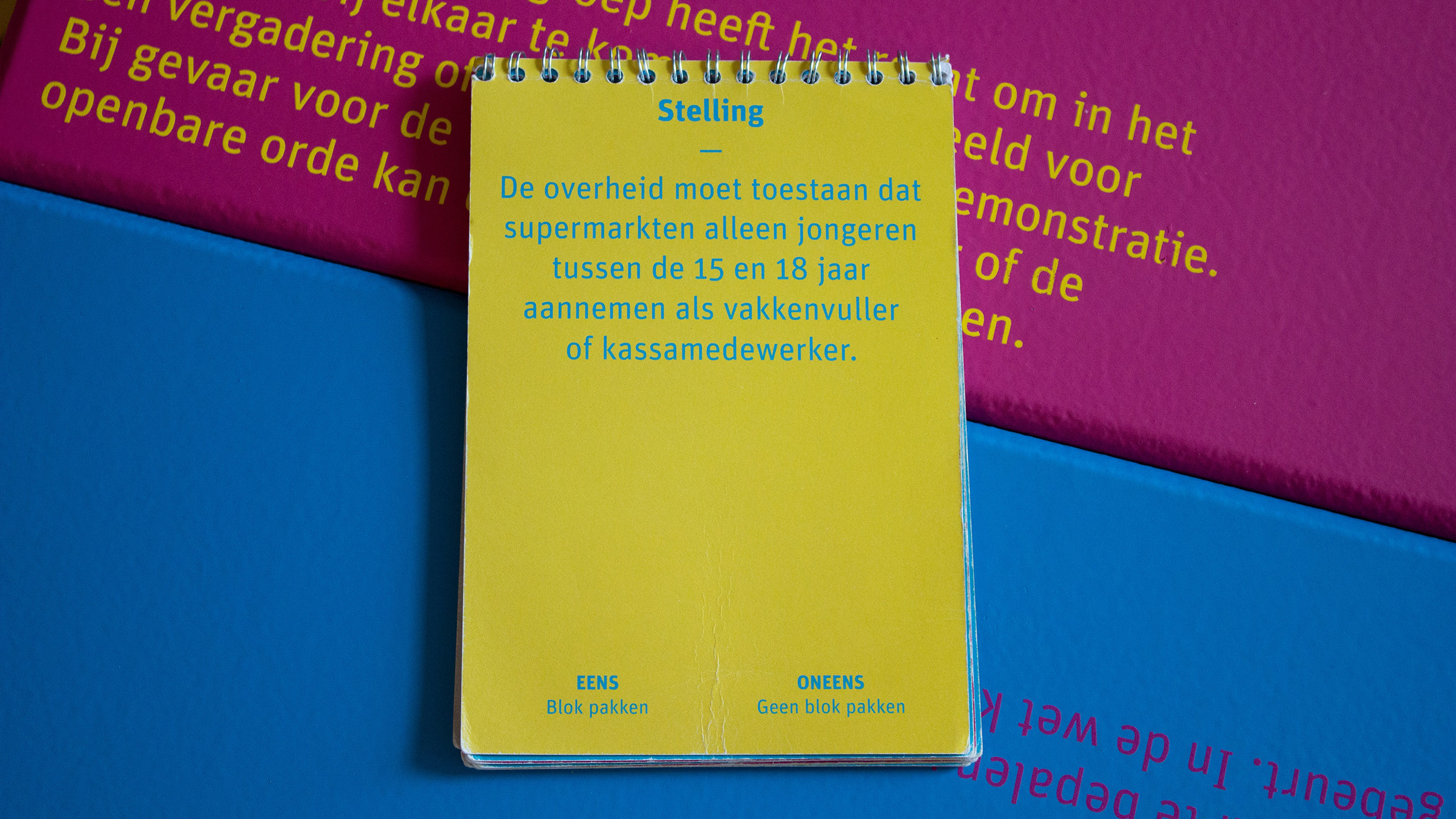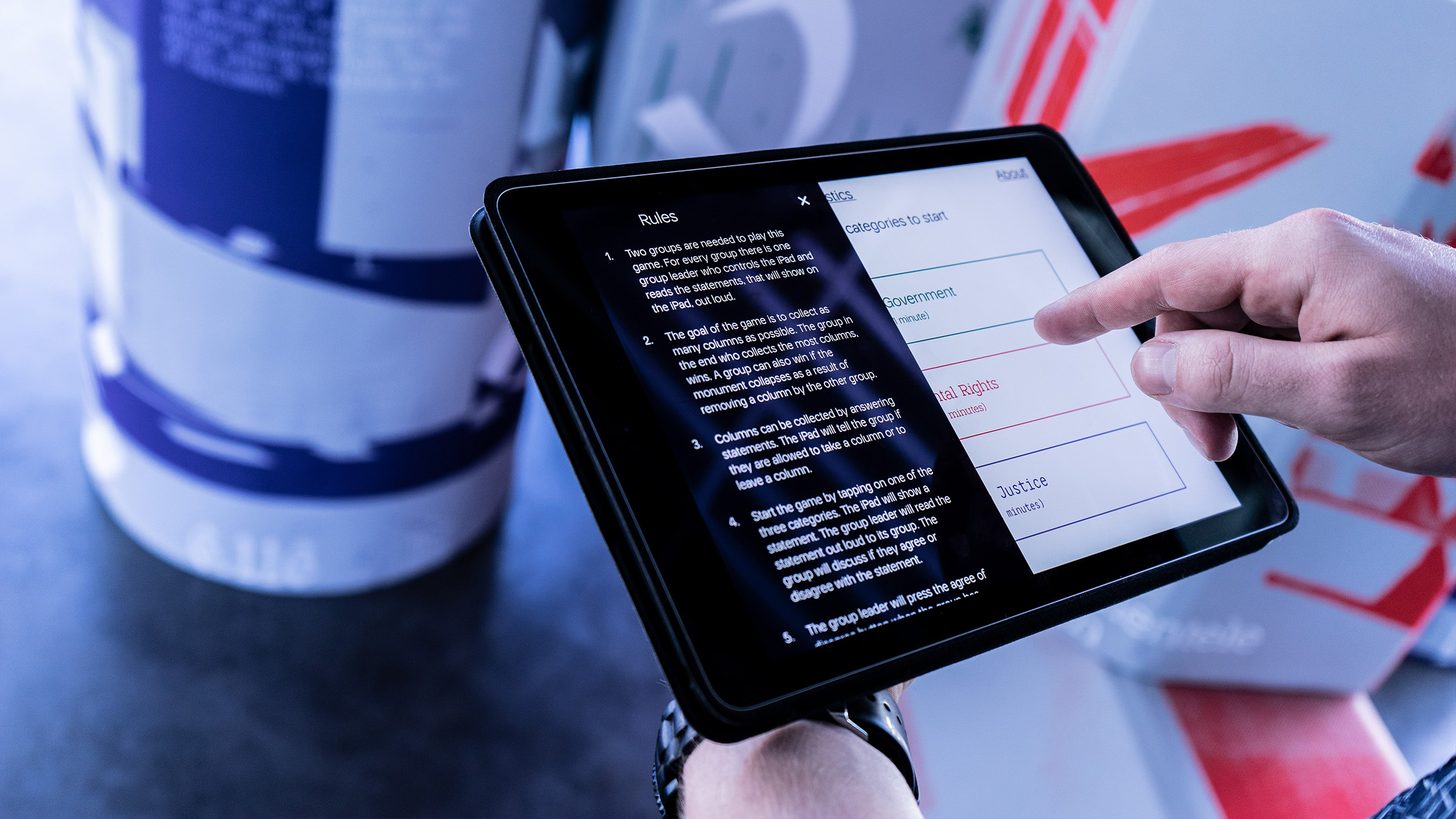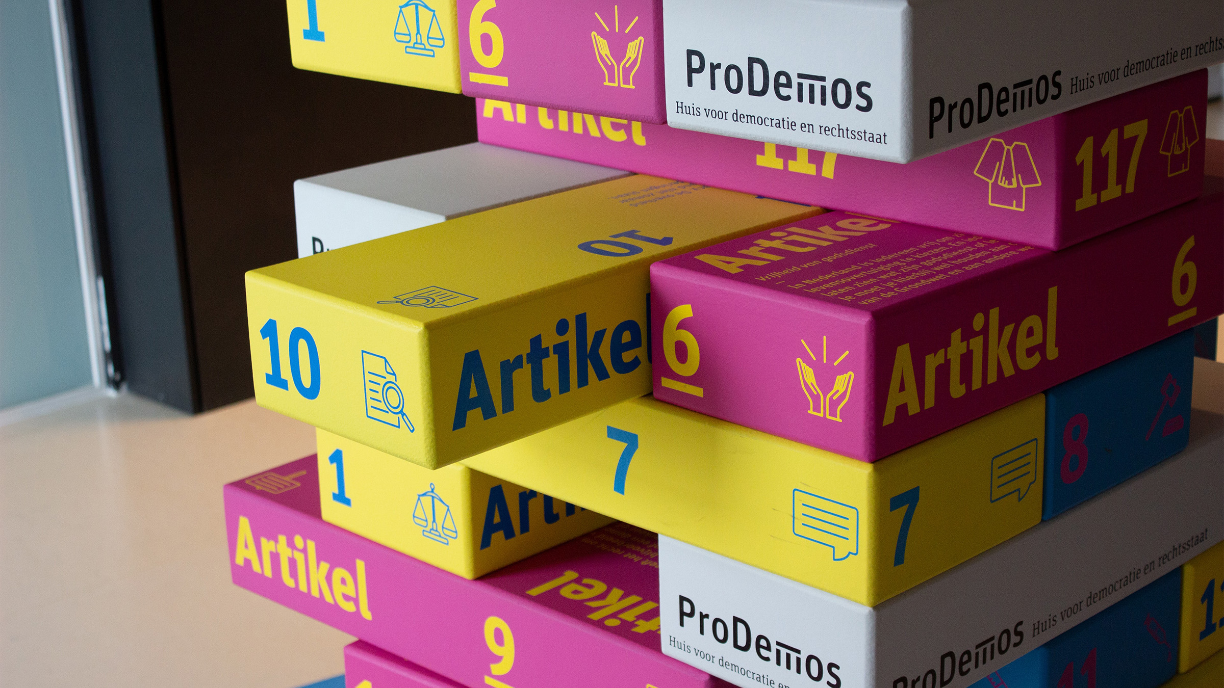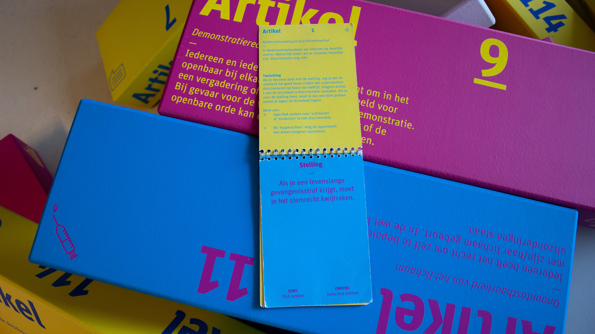 The constitutional articles together form the pilar of democracy. For every article, a statement was written to which students agree or disagree. Based on their opinion they have to take or remove a block from the pilar. By playing, the students learn about the importance of the Dutch contitution. When you ignore/remove too many articles, the pilar will be damaged or even fall. This doesn't mean however, that the constition is unchangeable.