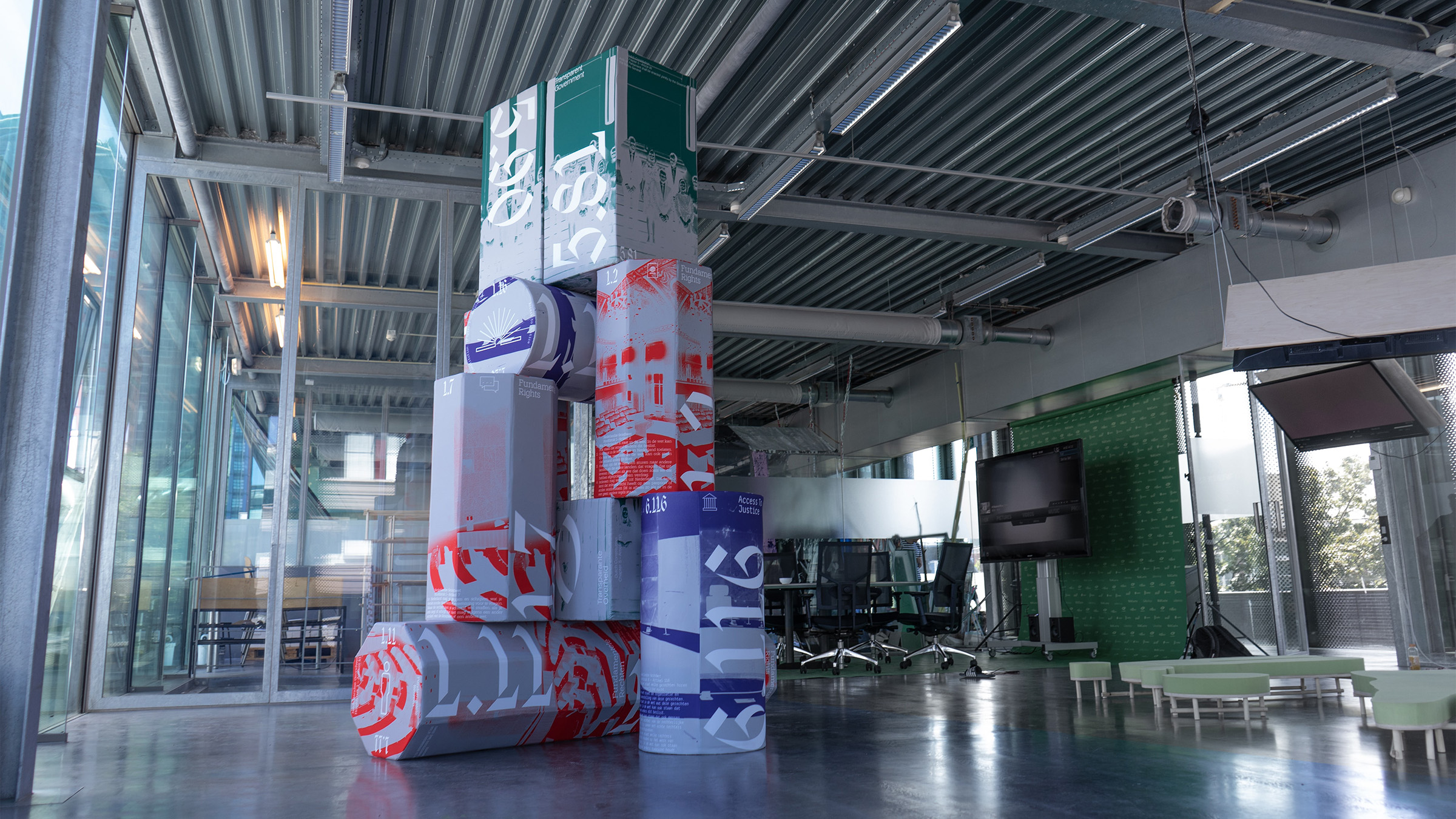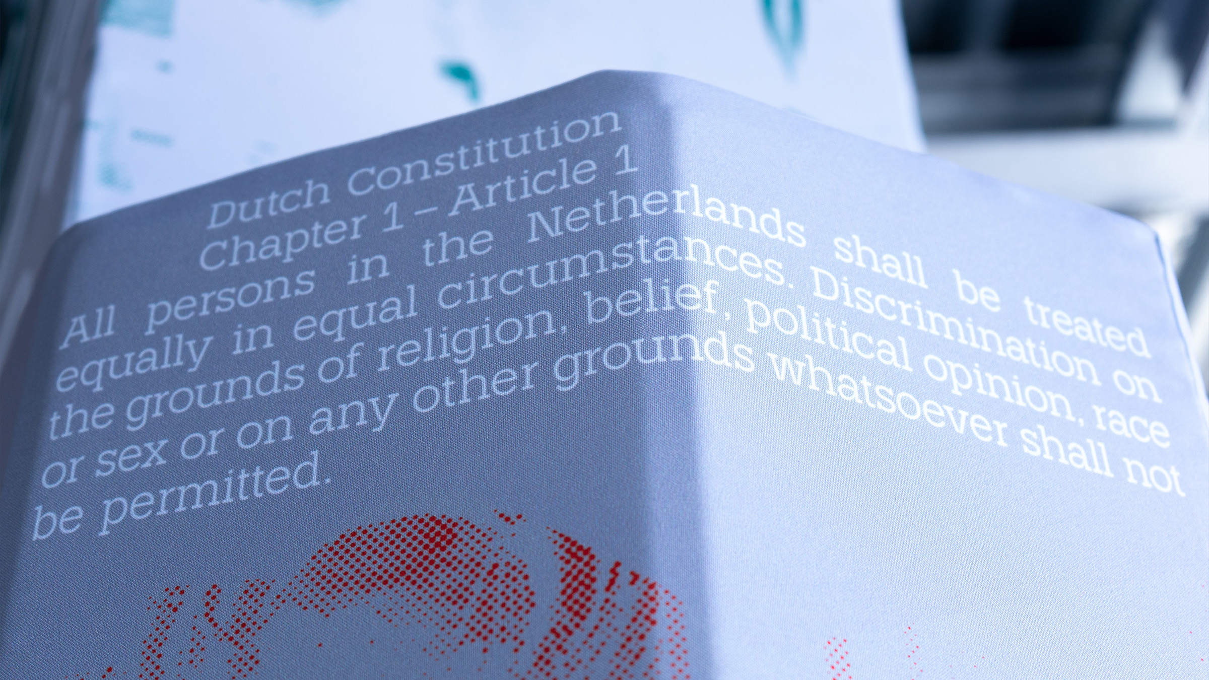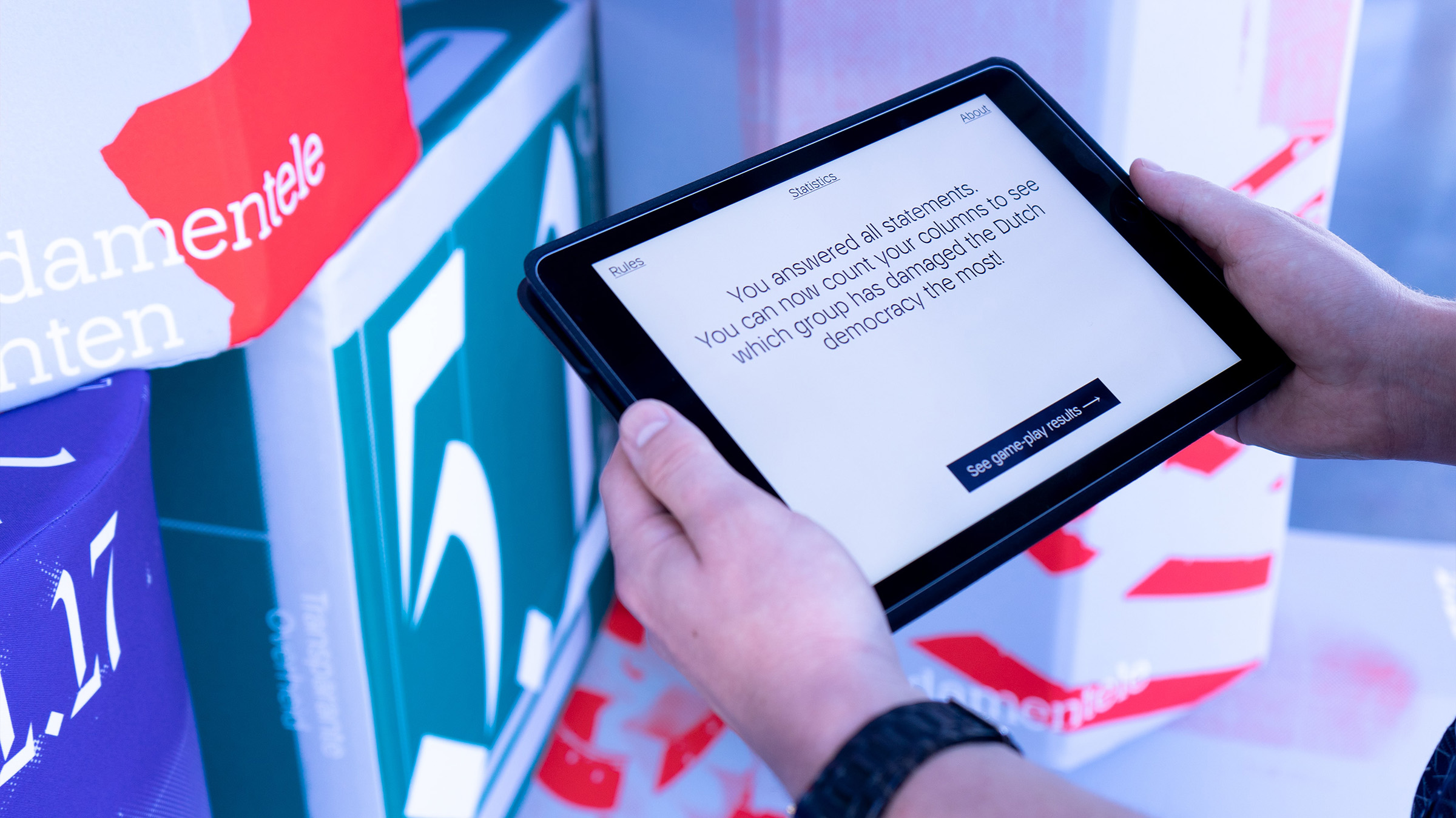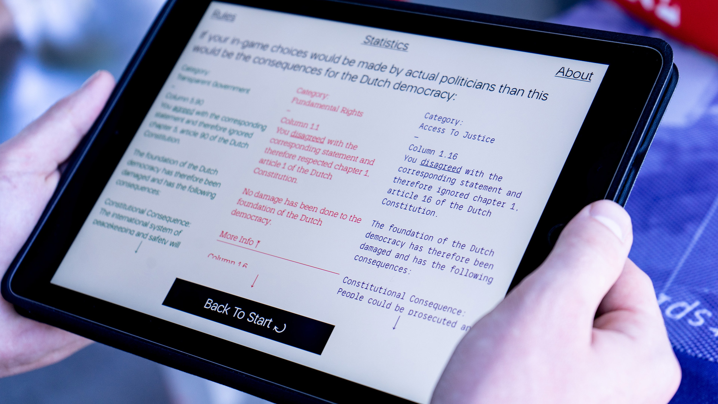 The 2017 election programs of the Dutch political parties contain 41 statements which are in direct violation of constitutional articles. I Hereby Pledge My Allegiance is a dynamic installation which portrays the impact and consequences for Dutch citizens or politicians ignoring the constitution. Presented as a game the installation invites the visitors to act as politicians and experience how their choices can either weaken or strengthen the constitution.
