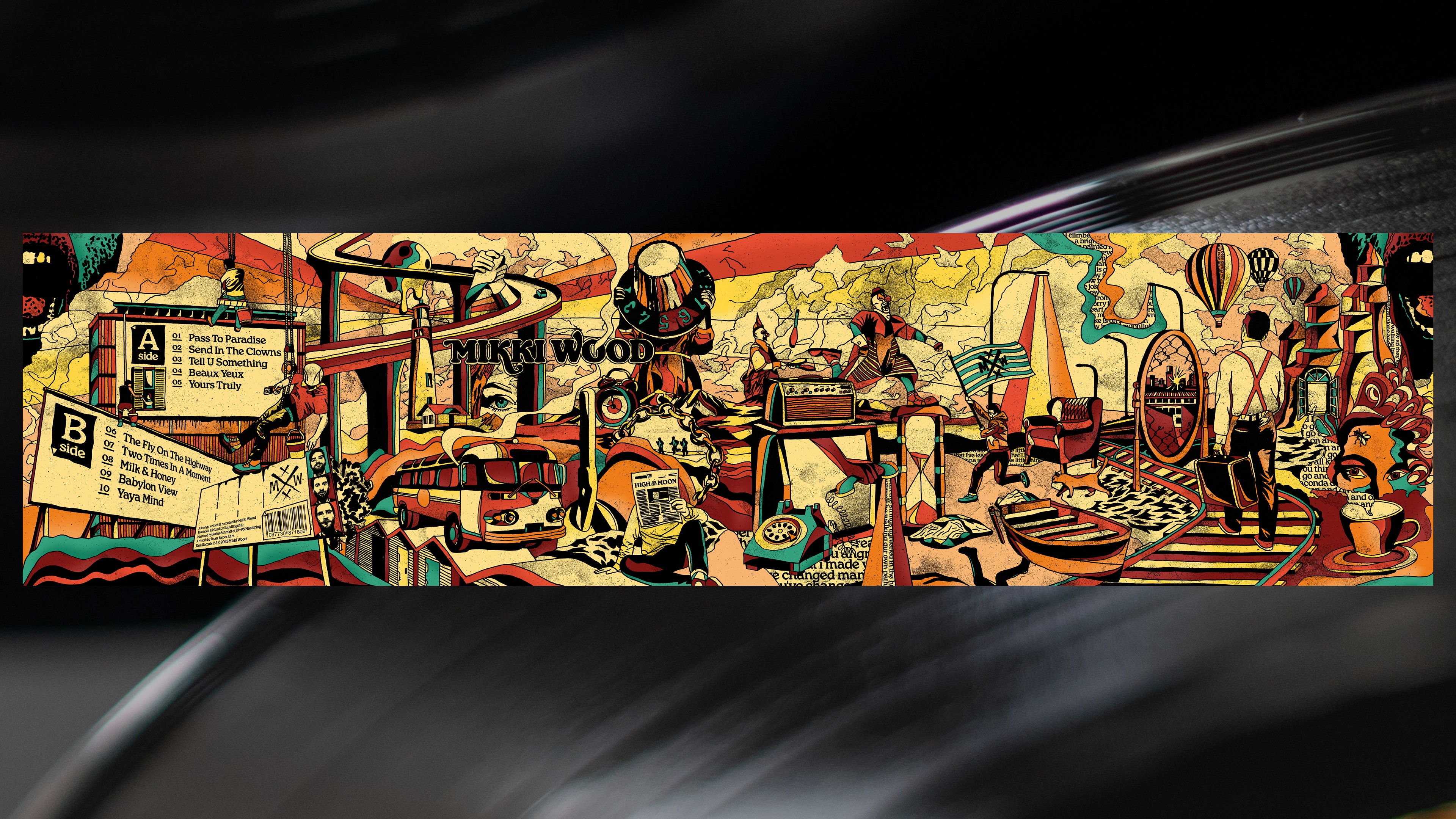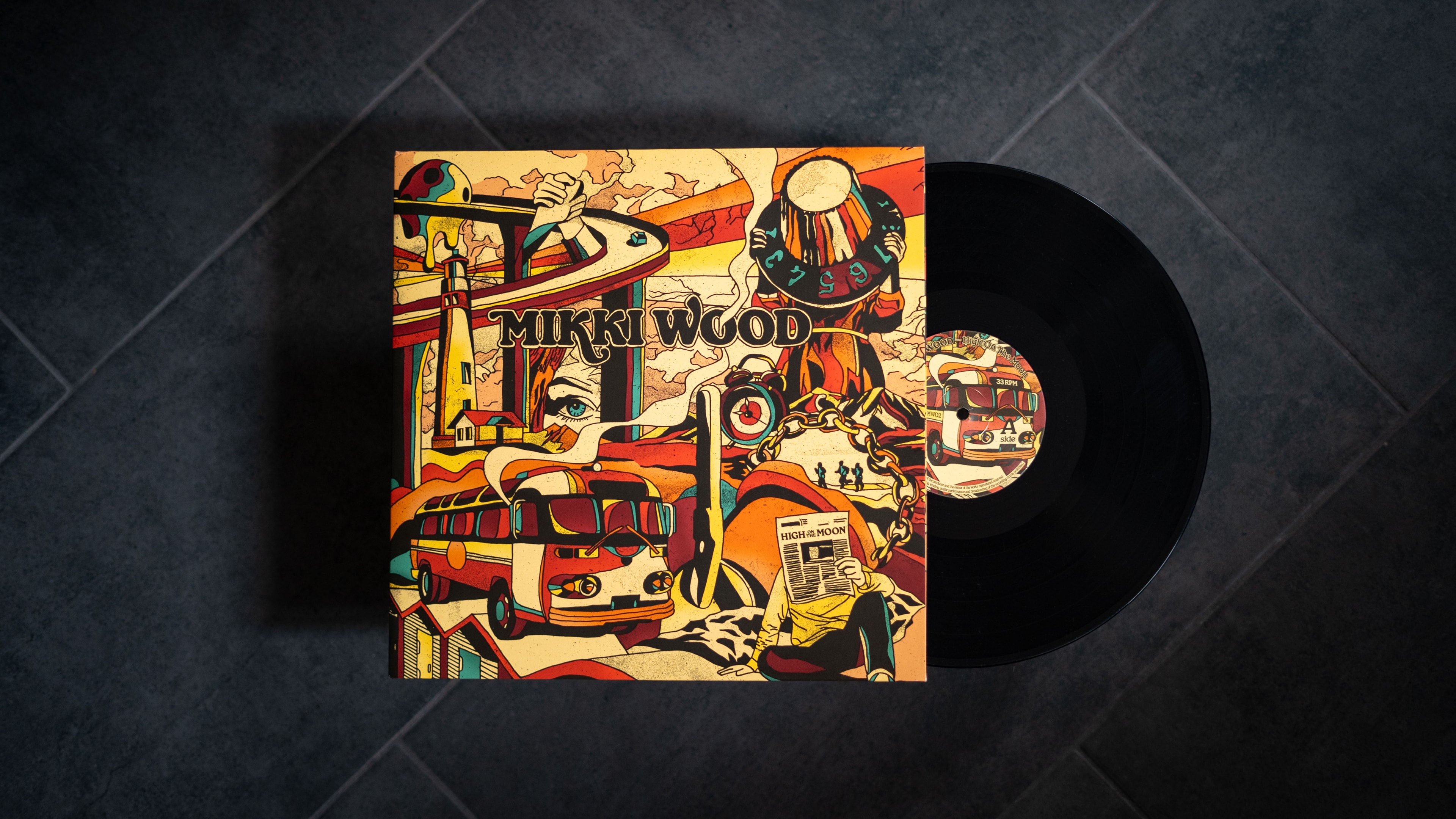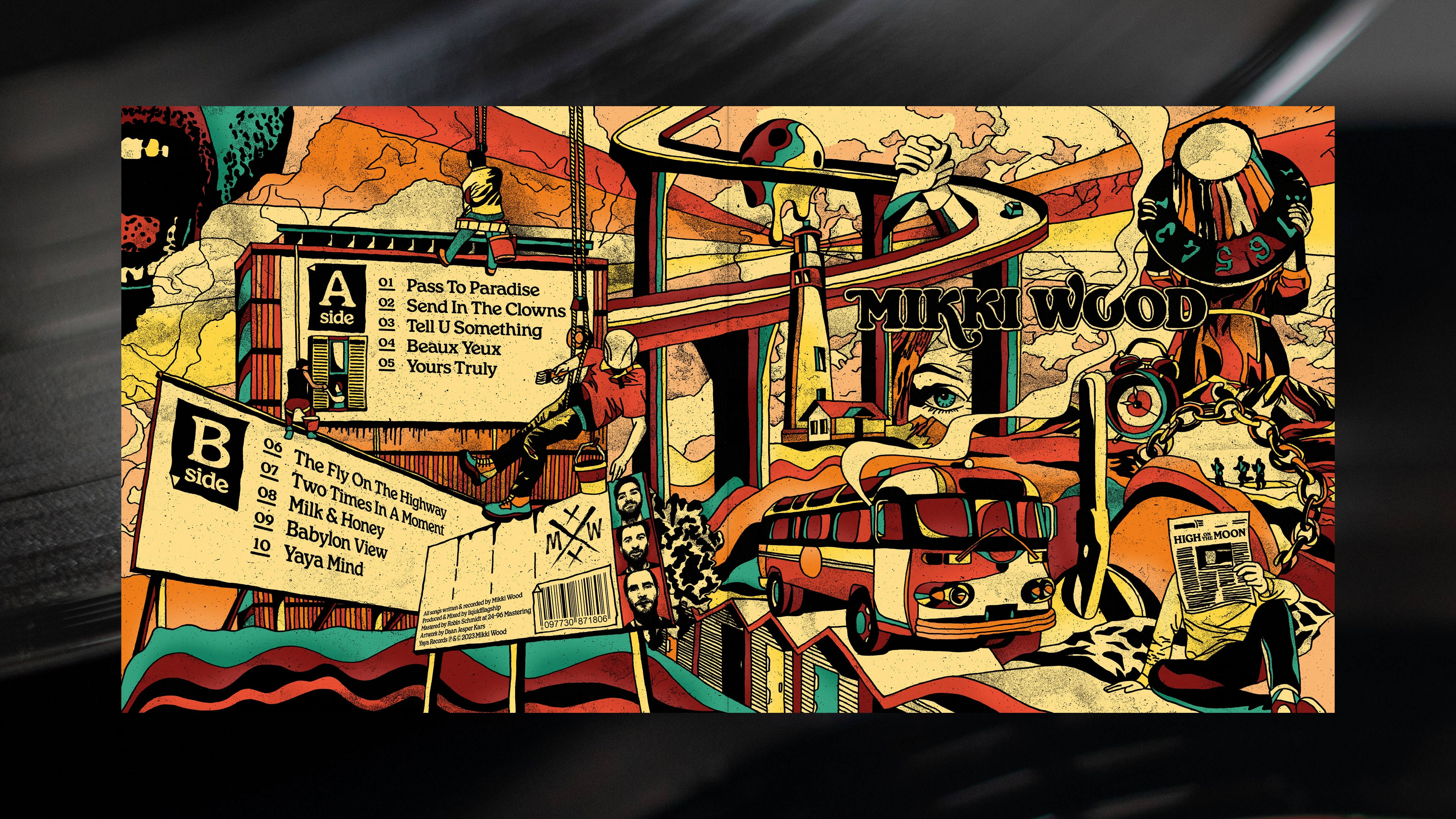 Artwork for Mikki Wood's 12" debut album High On The Moon, which perfectly captured the raw energy of their live shows. All the illustrations represent little parts of all the 10 tracks on the album. From cover to cover the illustration loops seemlessly. On stage, the band creates an atmosphere of total surrender, whether they’re playing in a small café or a larger venue. They always manage to bring the crowd into their performance. Since its formation, Mikki Wood has firmly embedded itself in the underground music scene, and the band continues to push new boundaries.
