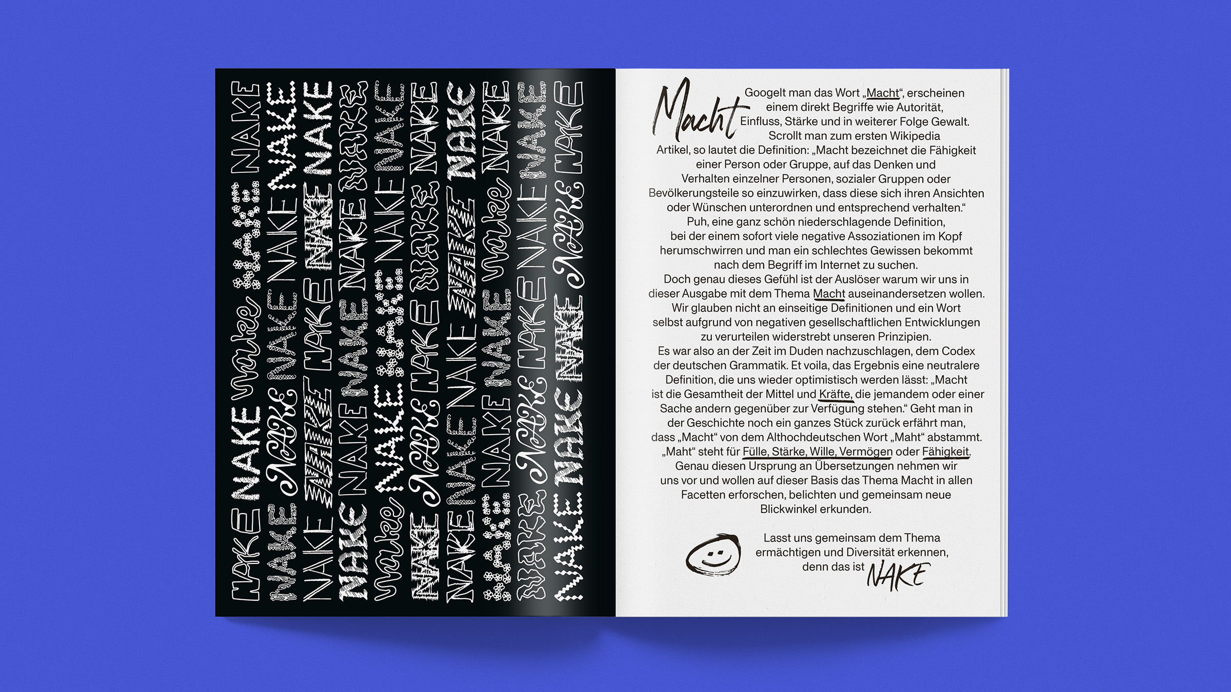 The second edition of NAKE Magazin is focussed on the topic of 'power'. The word 'power' is often connected with terms such as authority, influence, strength and even violence. NAKE however, wants to disconnect from the negative terms, and shine a new light upon the topic. This is why the second edition is more focussed on the questions such as: What is power? What power does the fashion industry have on nowadays society? What role does power have in martial arts? What can you learn about relationships, communication and trust through BDSM?