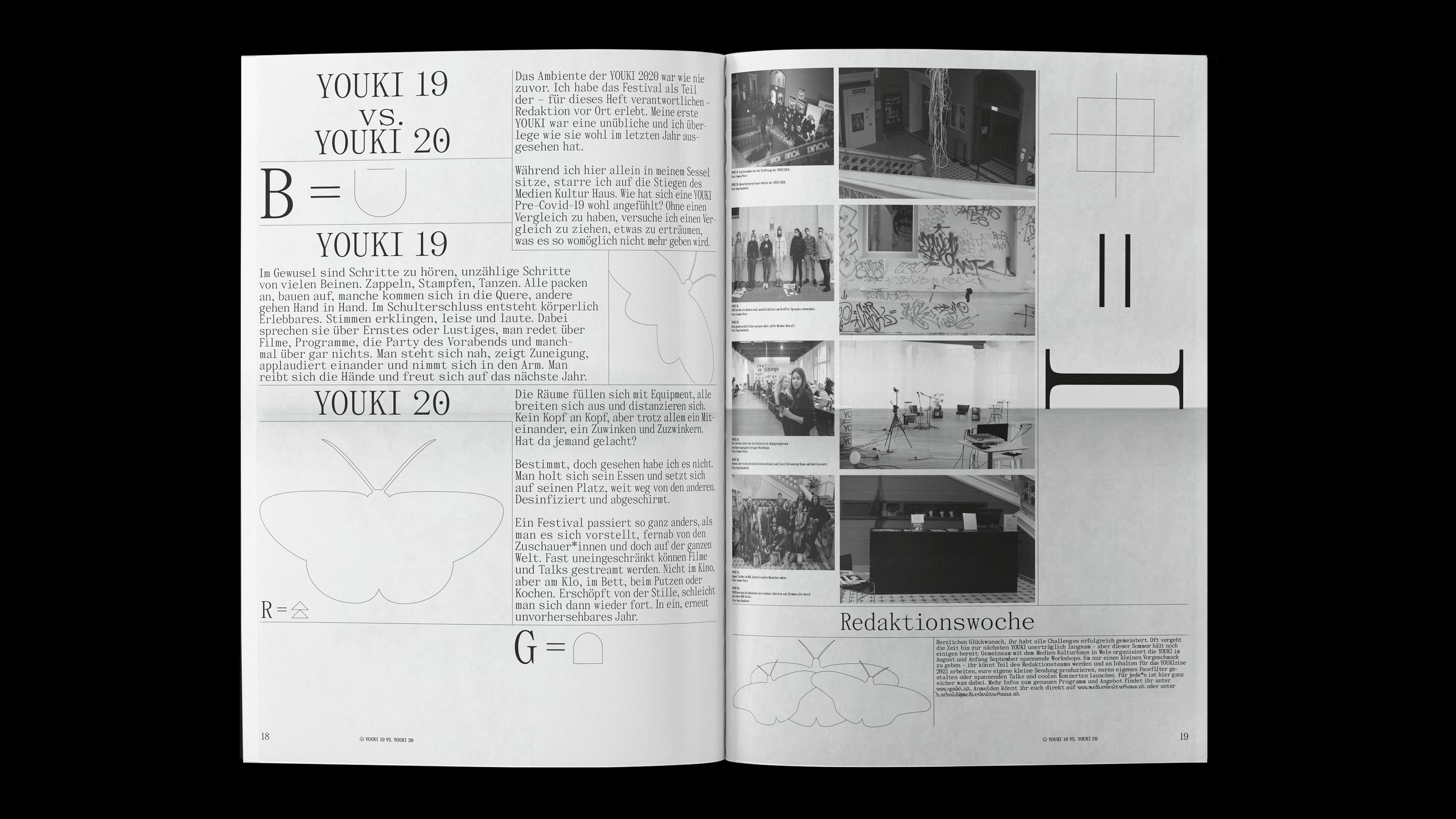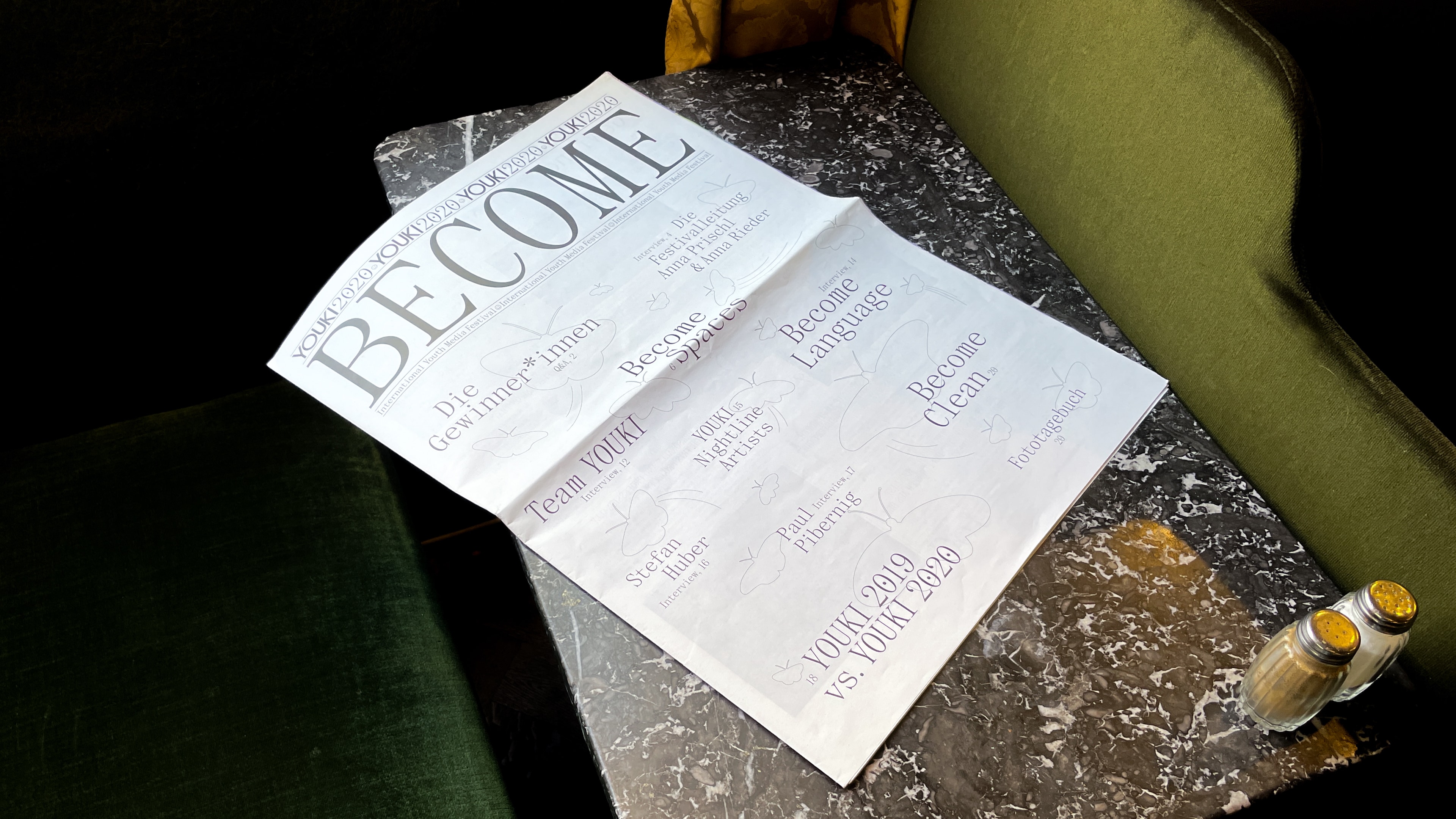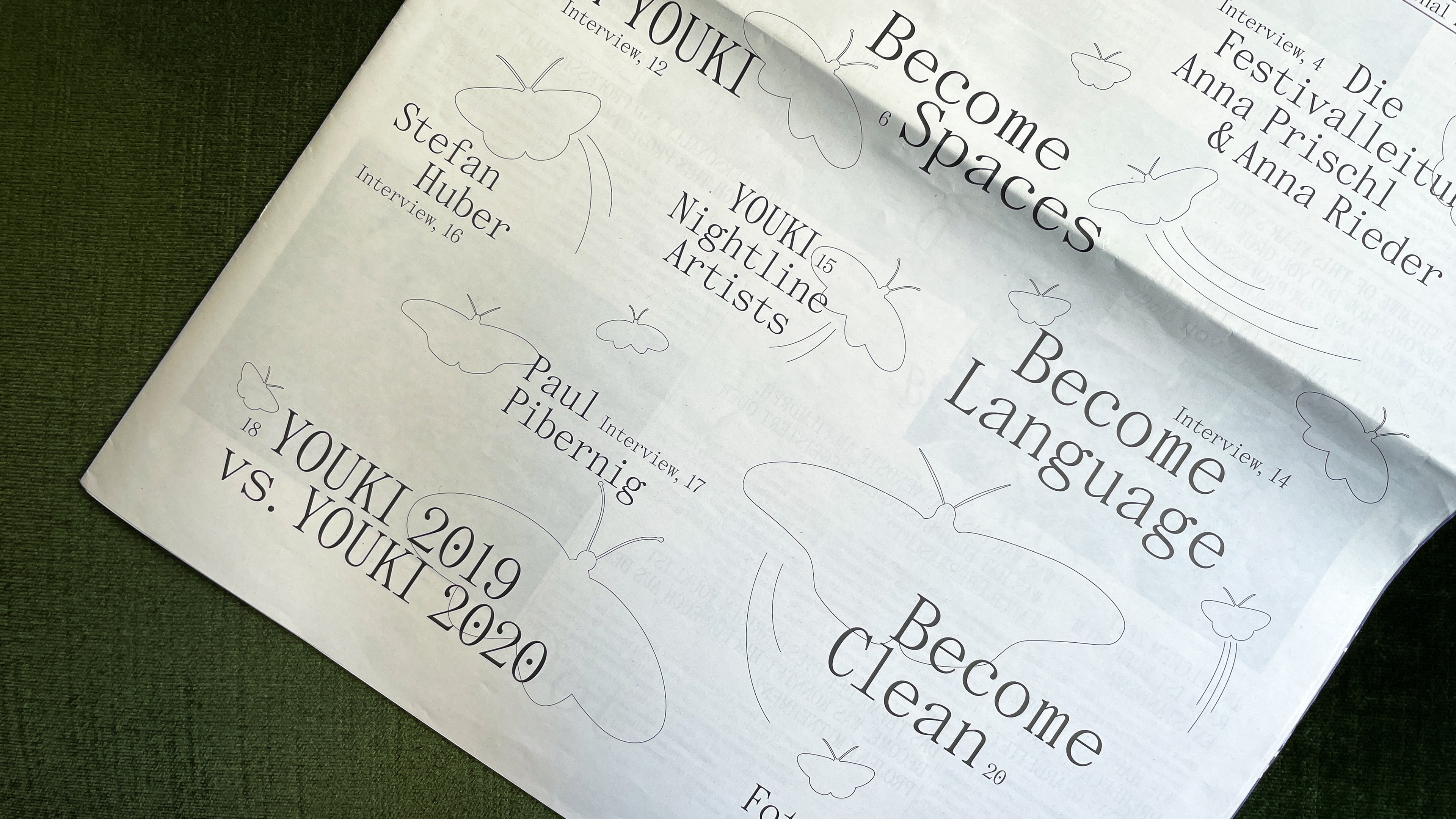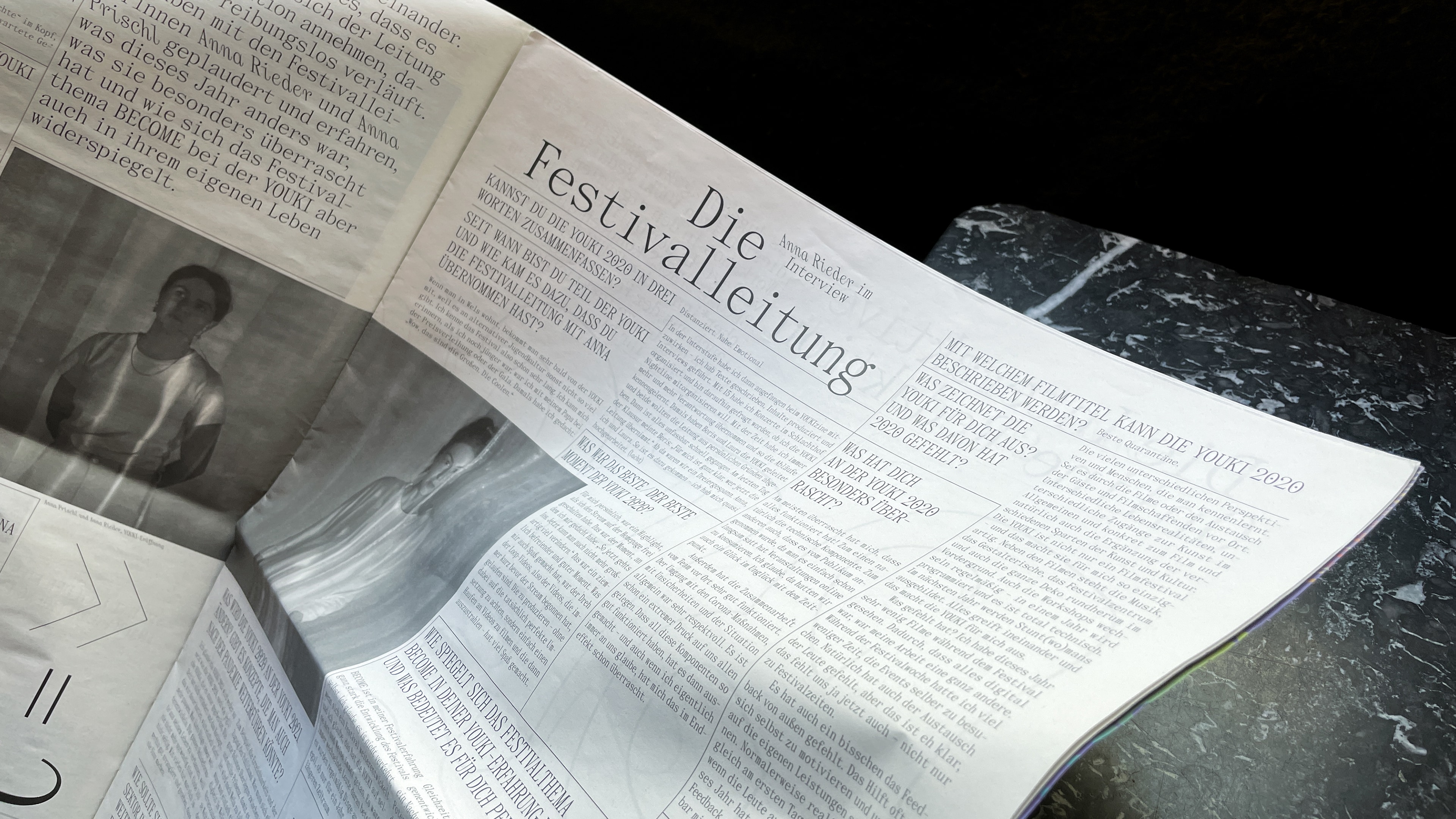 How can digital worlds be made physically palpable? The YOUKI Festival 2020 had to take place solely online due to the pandemic. It was essential to translate this digital space in the annual print edition and make it physically palpable. An immersive large scale zone was created – an analogue correspondent to the online festival, in which there are possibilities to get lost during reading and thus find new paths and spaces.