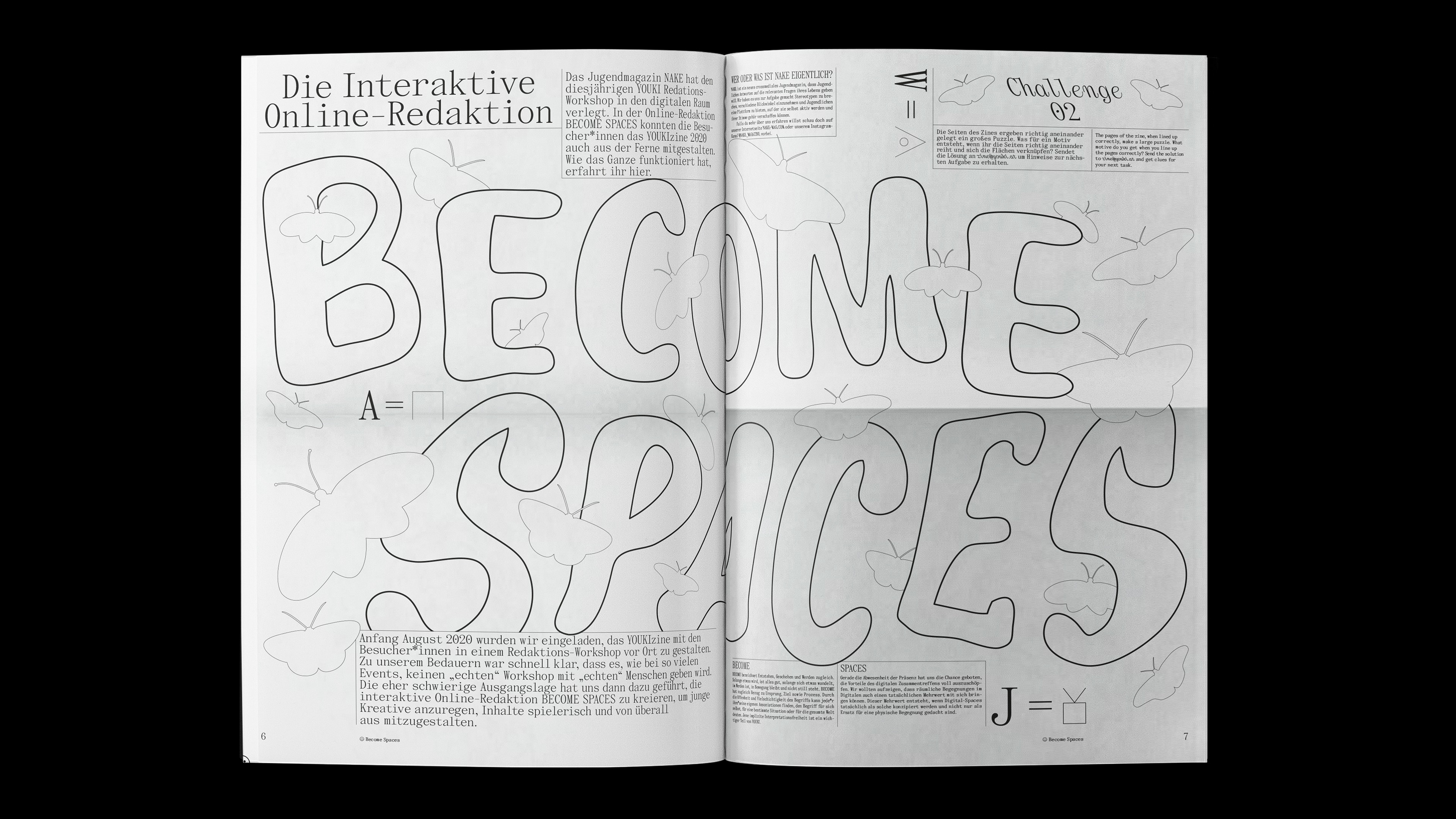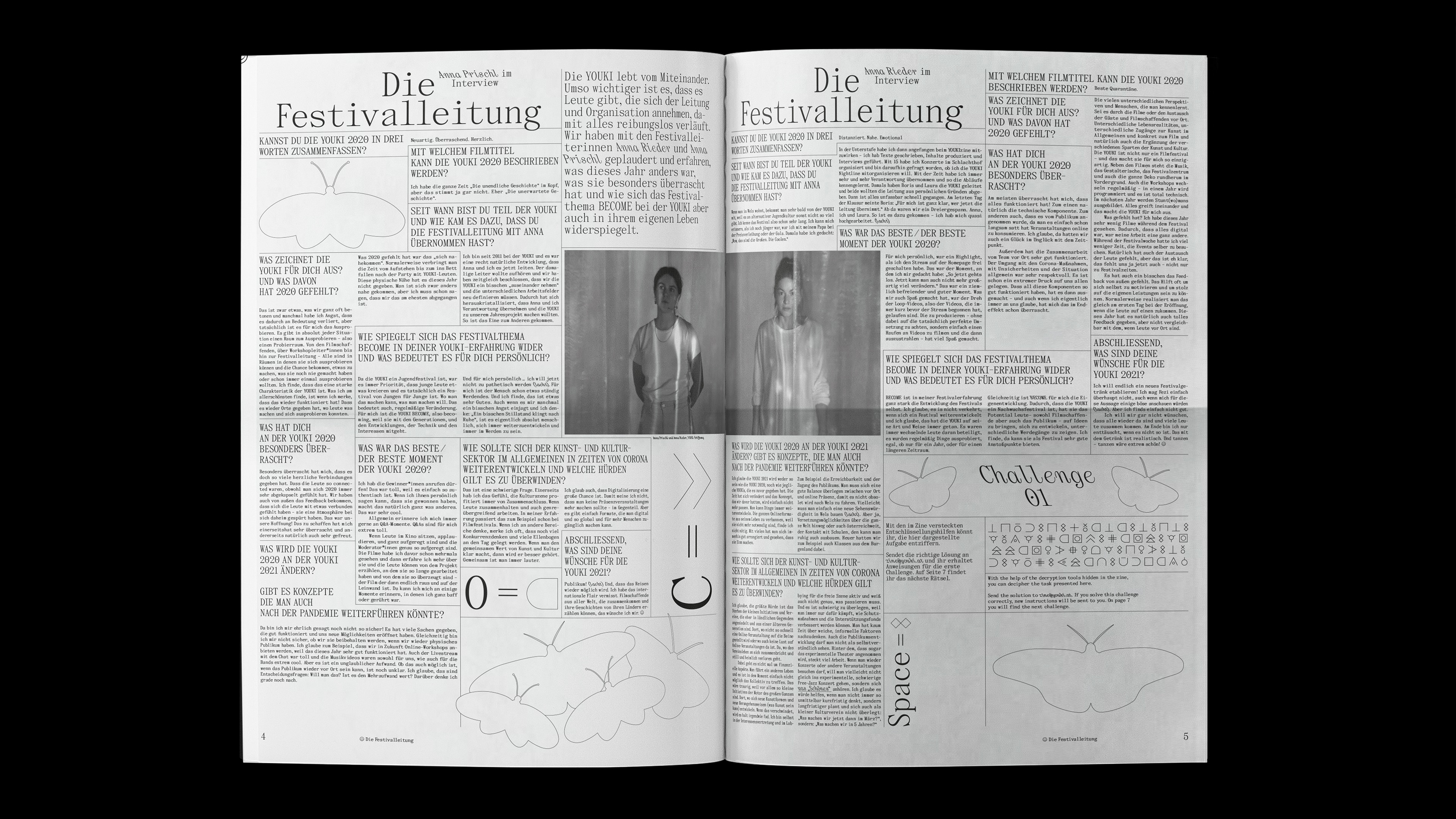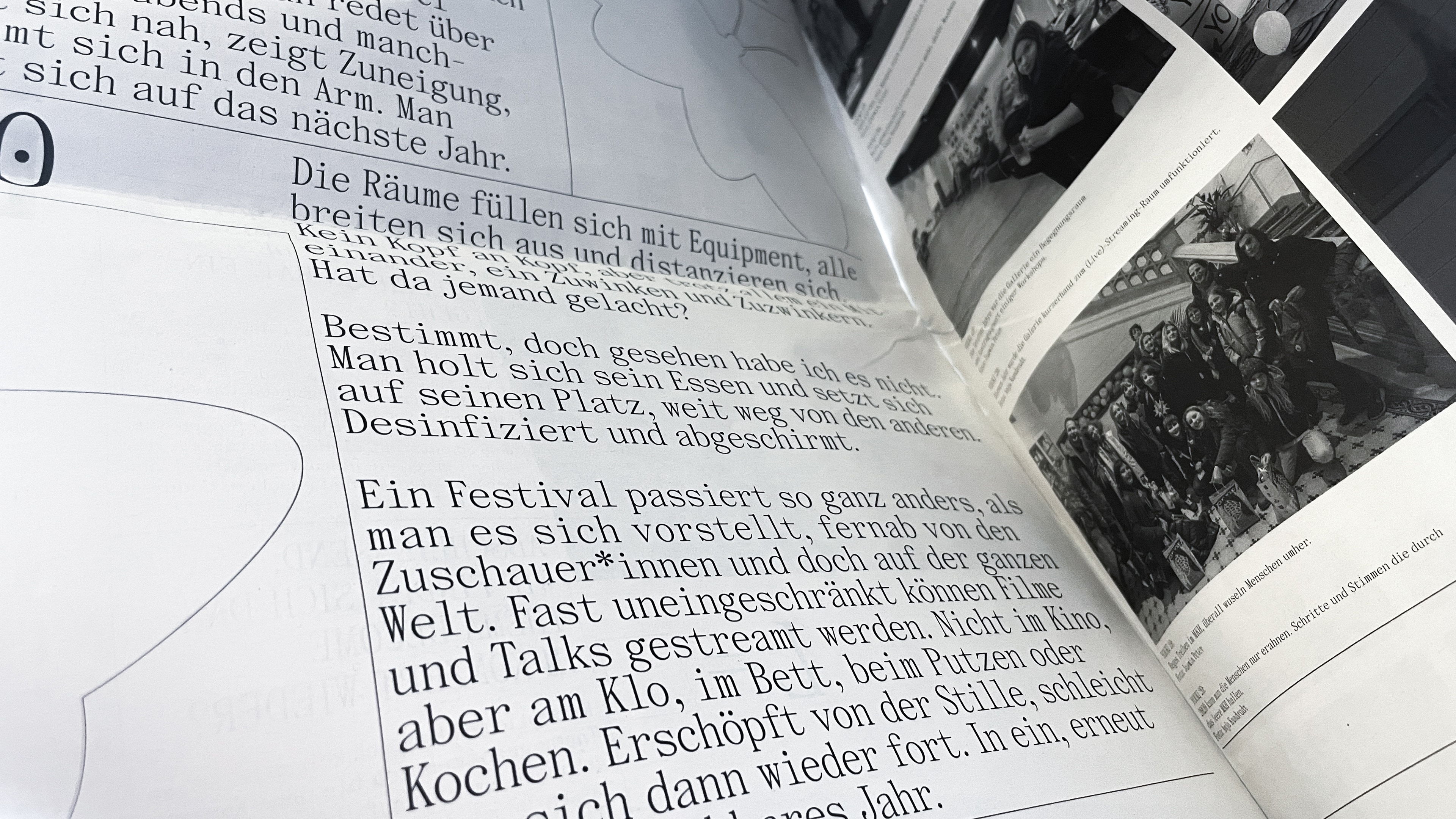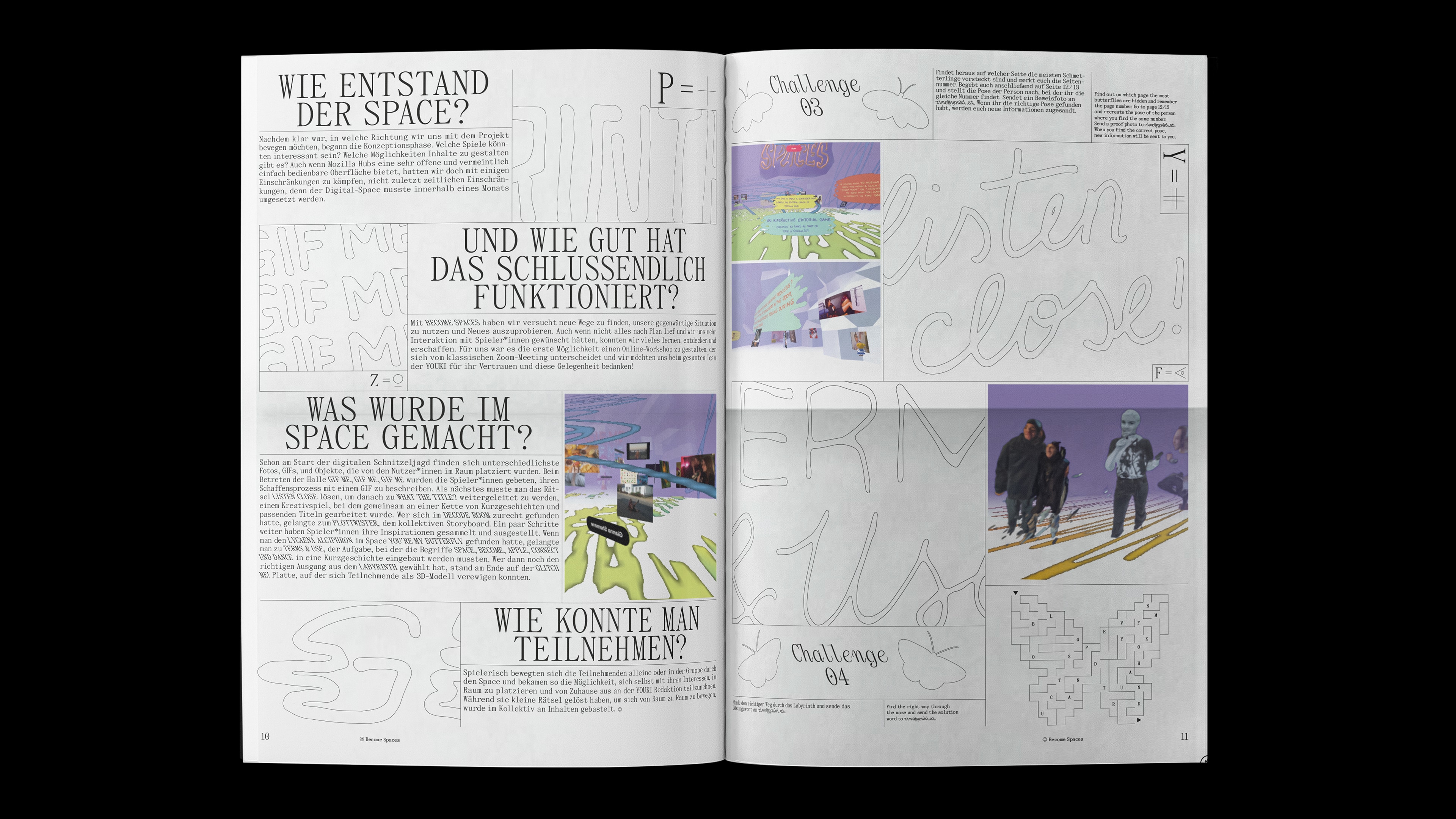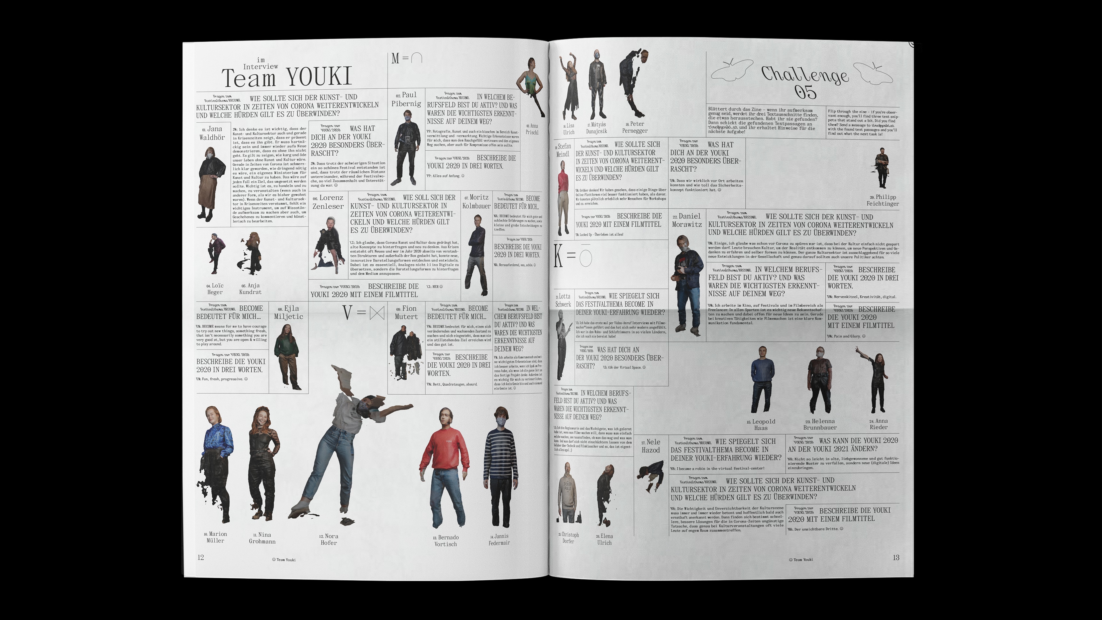 How can digital worlds be made physically palpable? The YOUKI Festival 2020 had to take place solely online due to the pandemic. It was essential to translate this digital space in the annual print edition and make it physically palpable. An immersive large scale zone was created – an analogue correspondent to the online festival, in which there are possibilities to get lost during reading and thus find new paths and spaces.