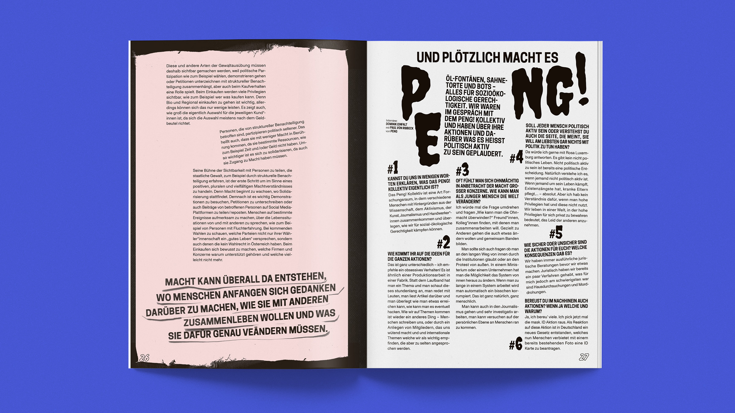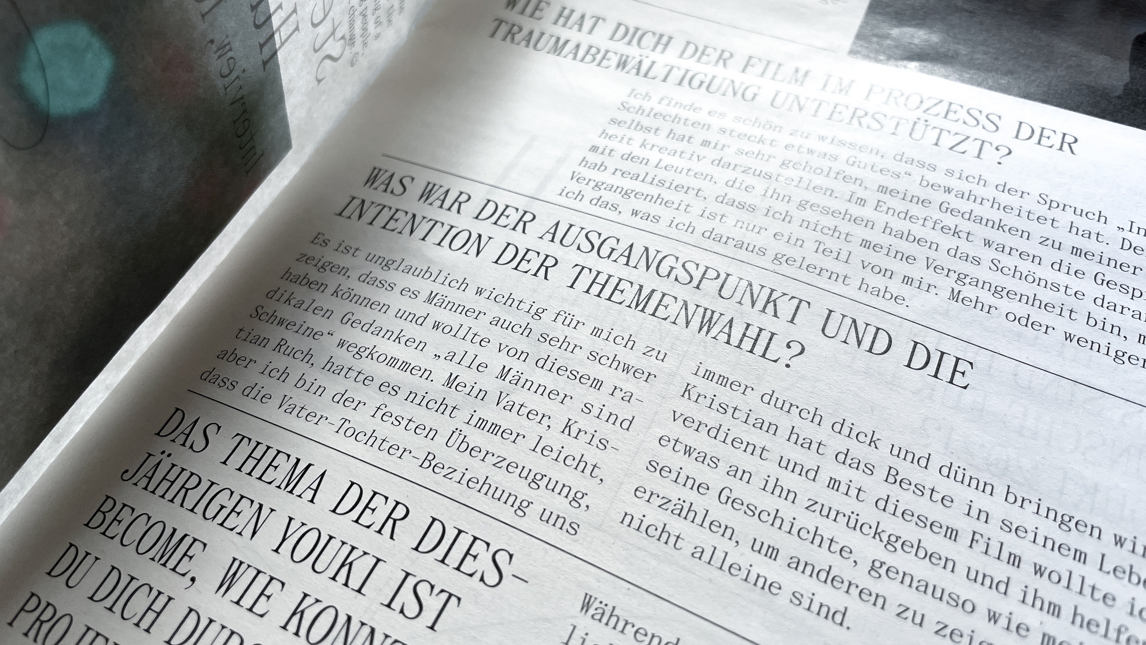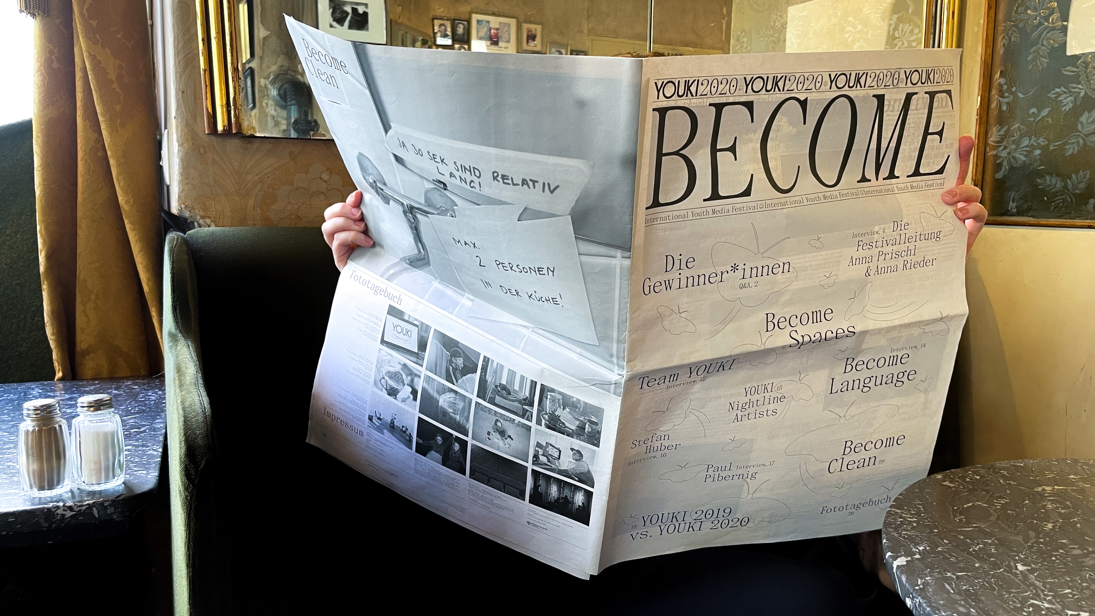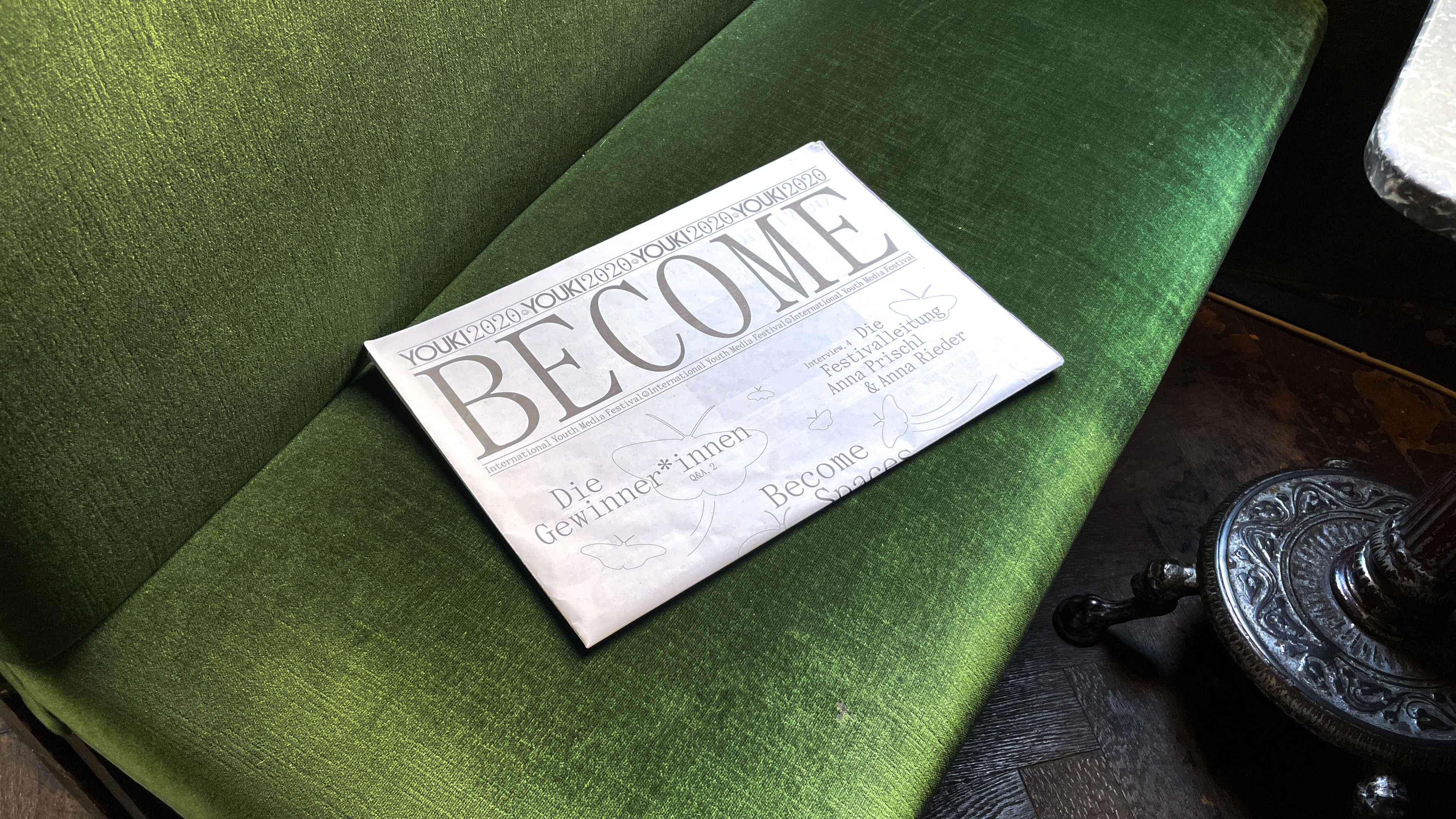 How can digital worlds be made physically palpable? The YOUKI Festival 2020 had to take place solely online due to the pandemic. It was essential to translate this digital space in the annual print edition and make it physically palpable. An immersive large scale zone was created – an analogue correspondent to the online festival, in which there are possibilities to get lost during reading and thus find new paths and spaces.