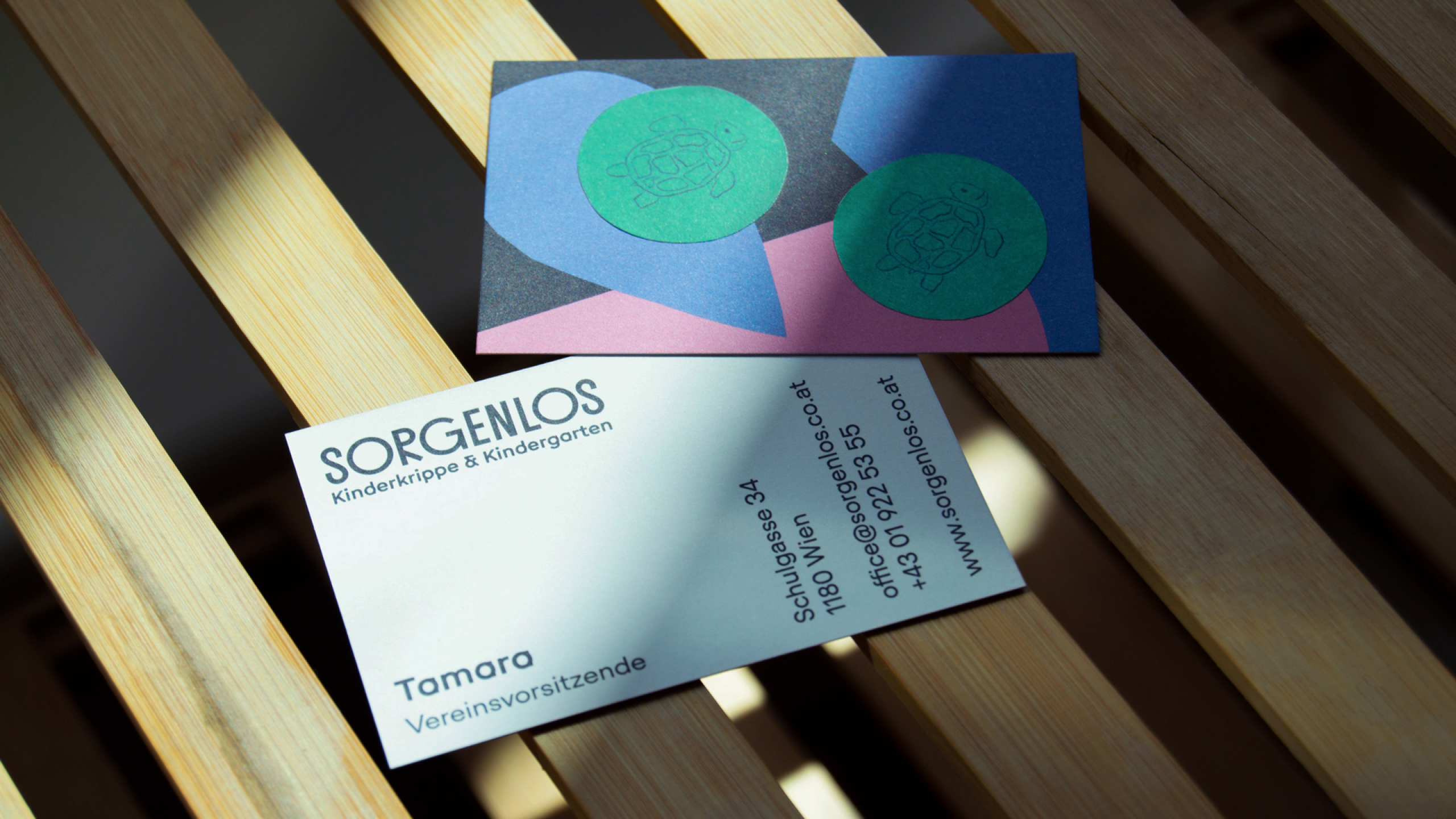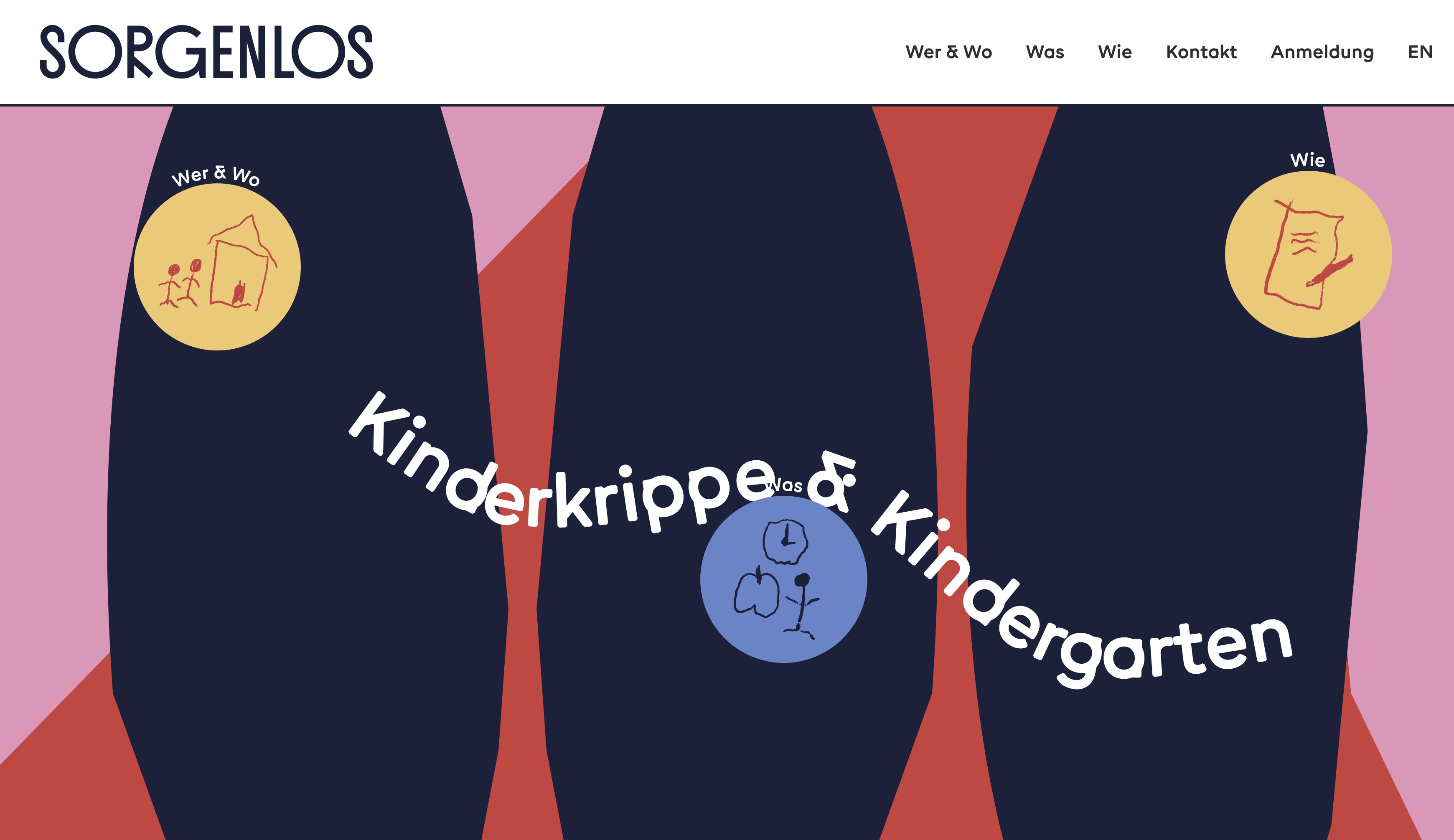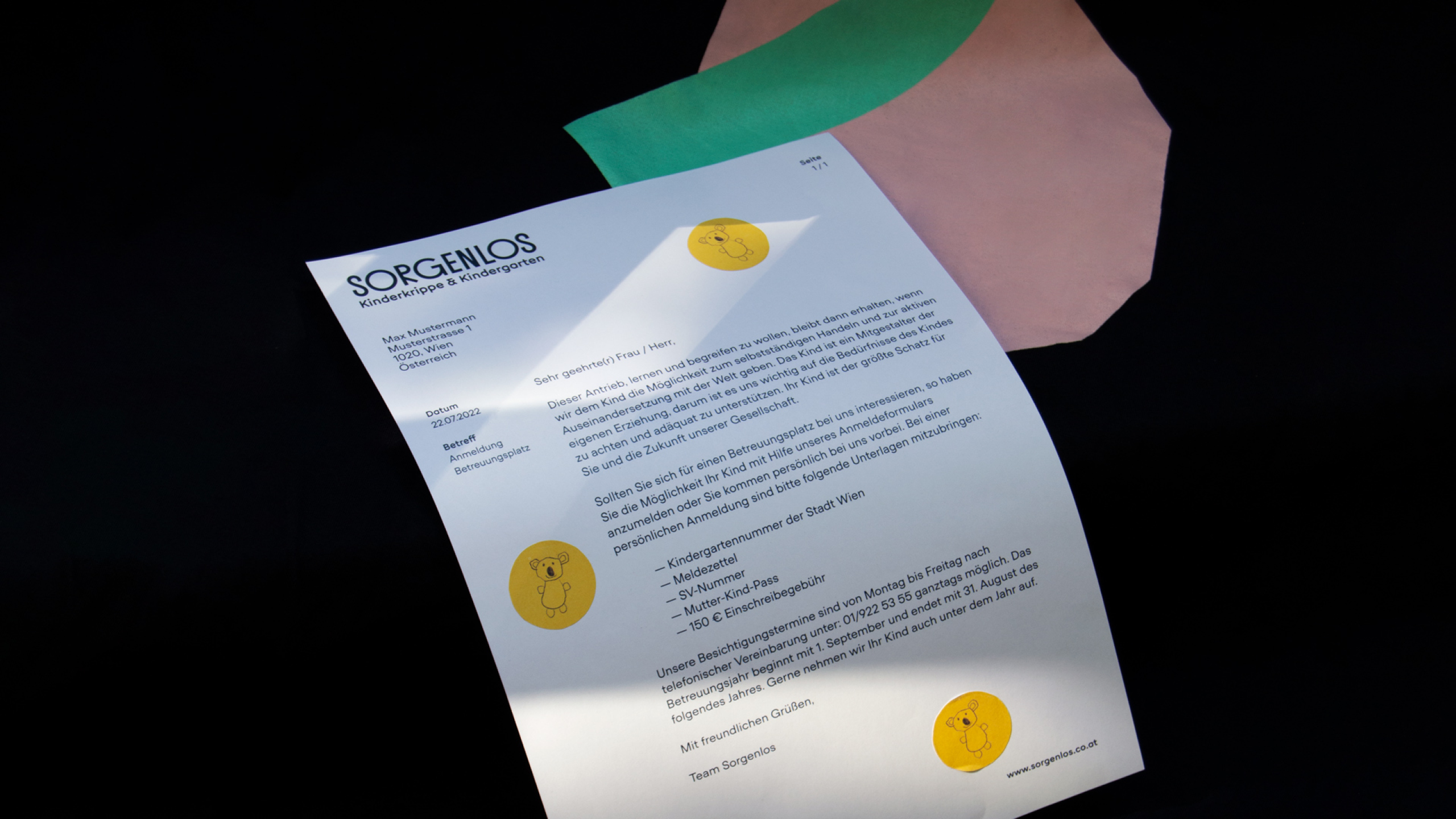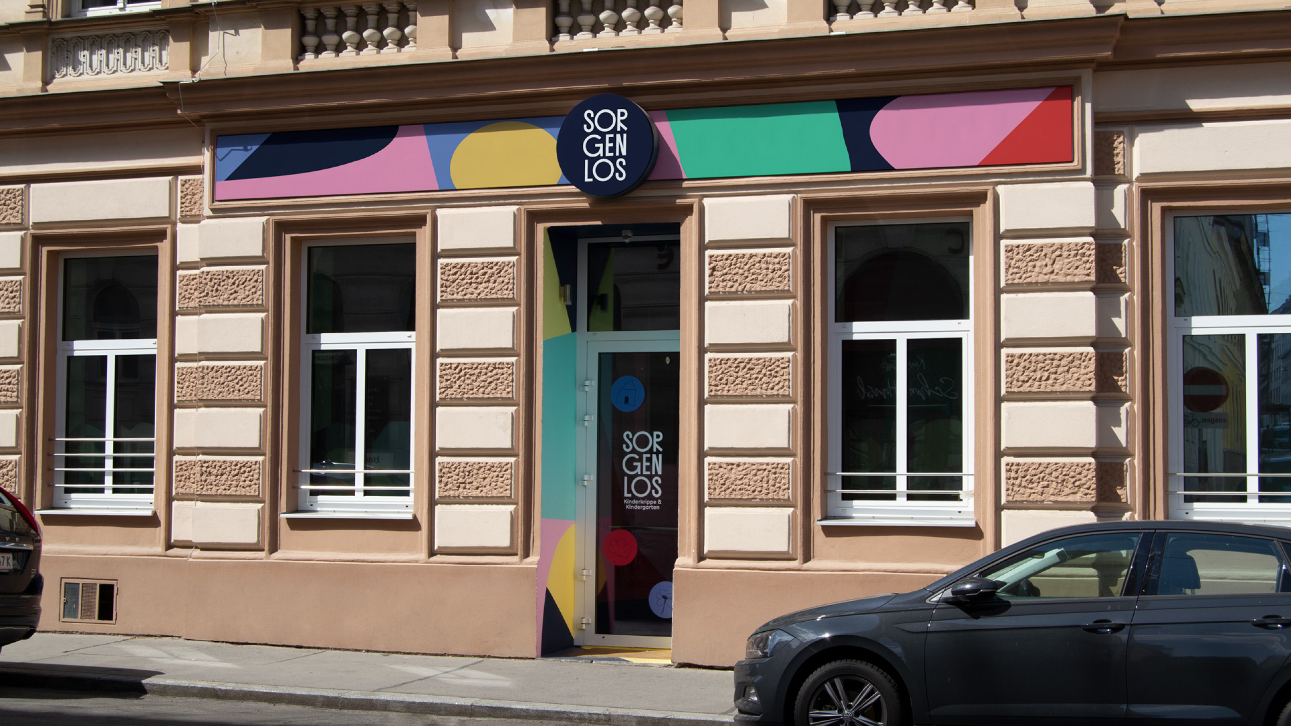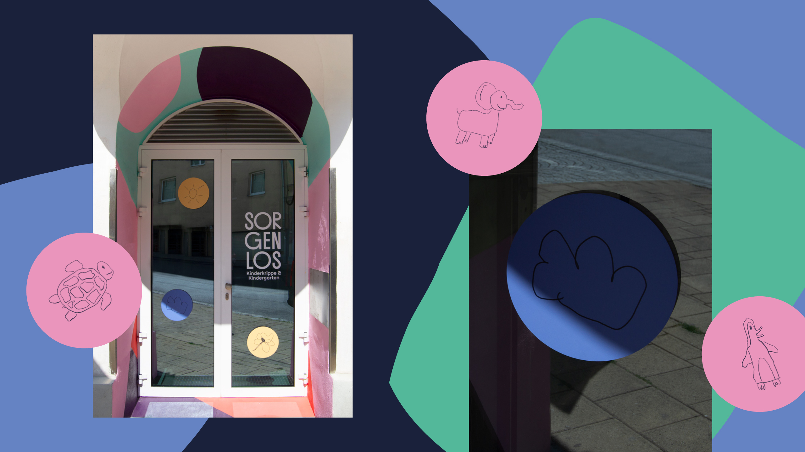 Brand identity for the kindergarten Sorgenlos in Vienna. The contrast between the world of kids and the world of parents set the main pilars for the design system of Sorgenlos: Playfulness & Informative. It's the kids set the tone of the kindergarten so we implemented that same principle in the design for the logotype and brand elements.
